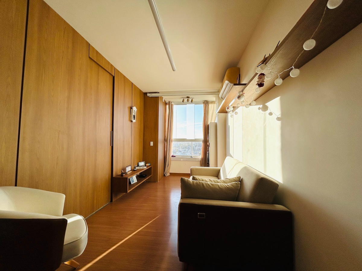 Studioleilighet tre minutter fra stranden. Bare kryss gaten, og om bare noen få skritt er føttene dine allerede i sanden! Har plass til opptil tre voksne eller et par og to barn, med en fantastisk utsikt. Bygningen tilbyr flere fasiliteter: svømmebasseng, treningssenter, barneområde, studierom og gratis roterende område. Den har også et konferanserom, grill og et filmrom til leie. Bygningen har restaurant, vaskeri, bakeri og nærbutikk. Utmerket beliggenhet, nær kjøpesentre.