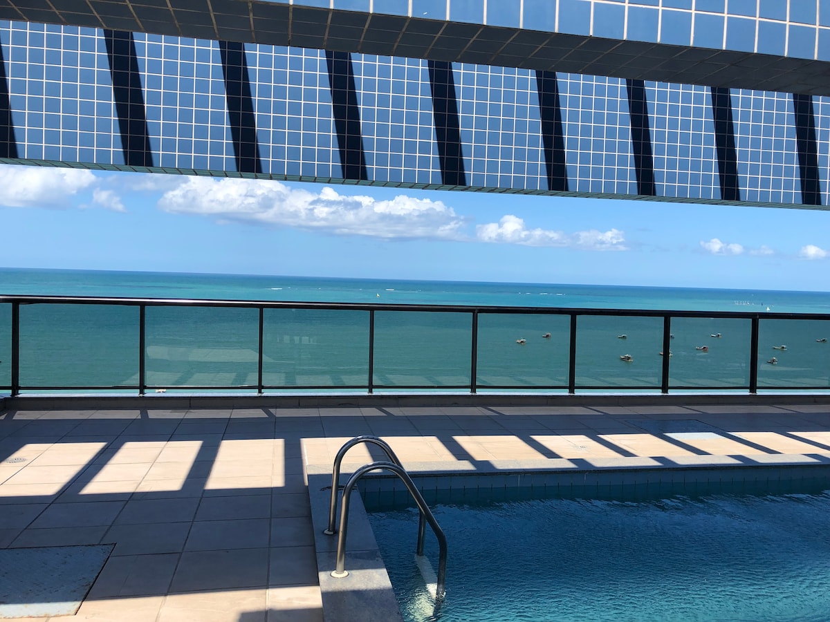 NYRENOVERT OG MODERNISERT - Svært koselig leilighet med bred og utmerket utsikt over havet i Ponta Verde. 6. etasje. Rom med klimaanlegg. Alt kjøkken, seng, bord og badeutstyr. Beliggende i den mest berømte beliggenheten i Maceió, trenger du ikke en bil for å få tilgang til de mest turistede stedene i byen. I nærheten av barer, restauranter, apotek, bakerier og supermarkeder. Kun 70 m fra sjøen.