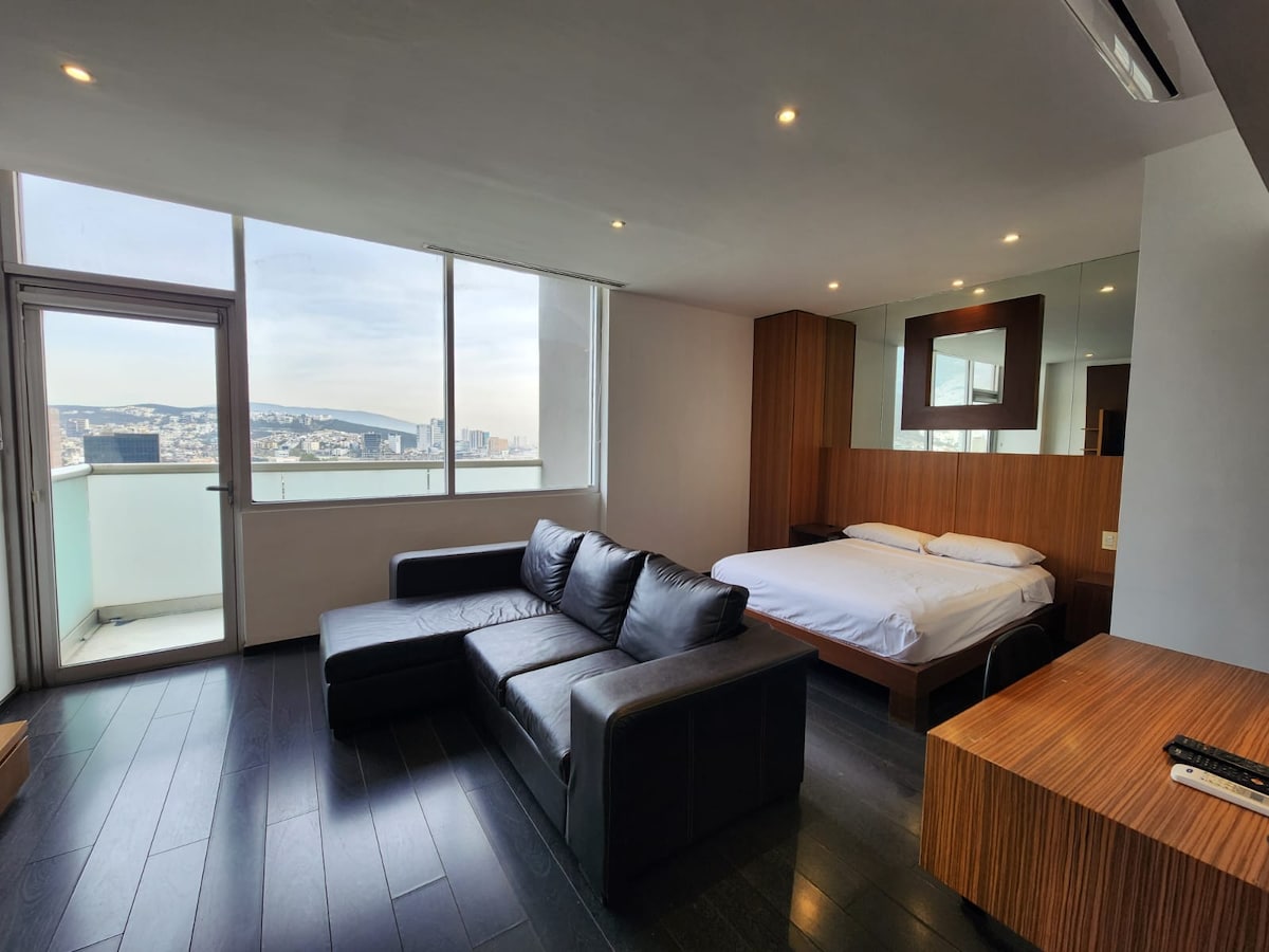 Velkommen til Monterrey! Jeg stiller min spektakulære leilighet til din disposisjon: Du vil ha en uslåelig panoramautsikt over hele byen og de fantastiske fjellene som omgir oss. I tillegg har du tilgang til et basseng i toppetasjen av bygningen, og et treningsstudio for å holde deg i form. Bli kjent med den lokale kulturen og utforsk de mest pittoreske hjørnene av byen, og nyt utelivet i Barrio Antiguo (kaféer, barer, restauranter og det beste utelivet i byen.