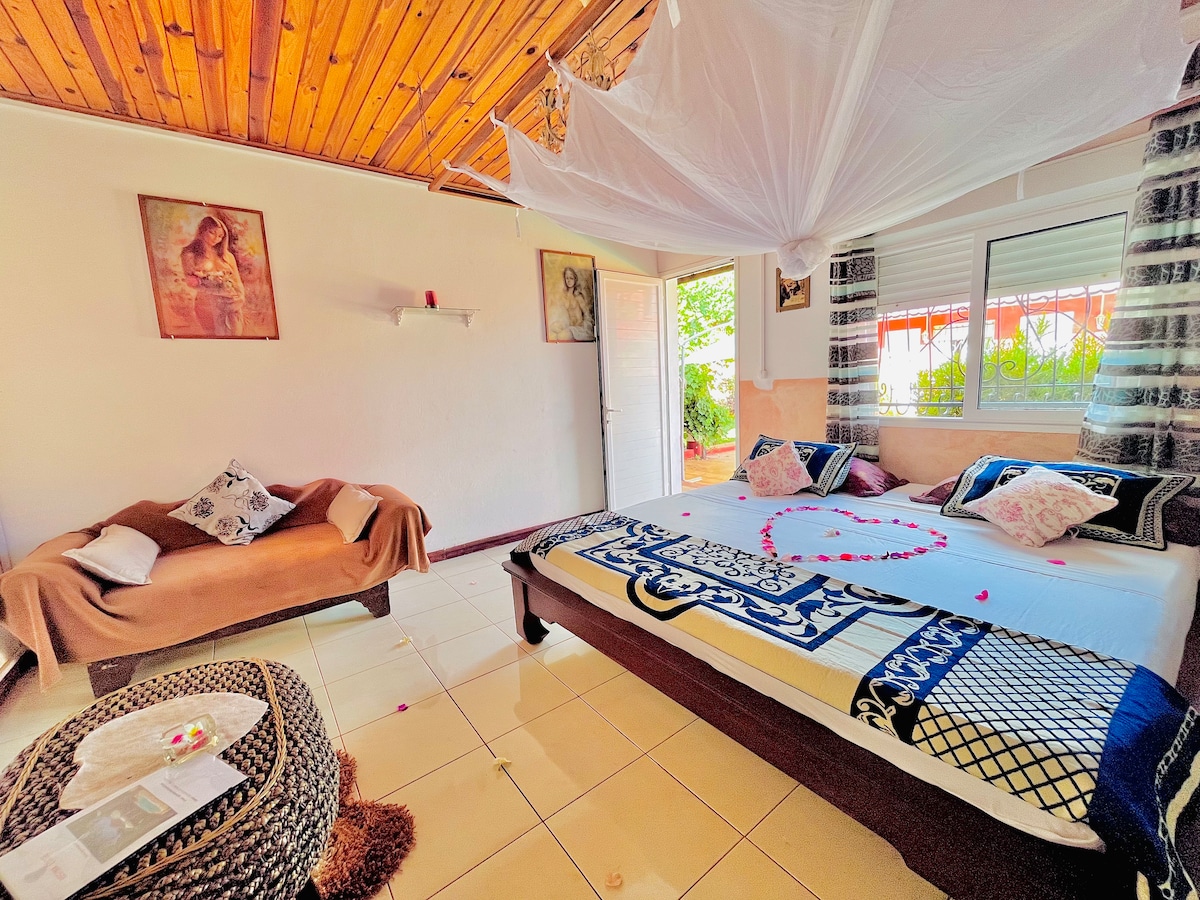 Bungalowen ligger på toppen av området til villaen «det er livet» i naturen blant tropiske frukter og frodig vegetasjon med havutsikt og solnedgang fra det 20 kvm store utendørs badet.