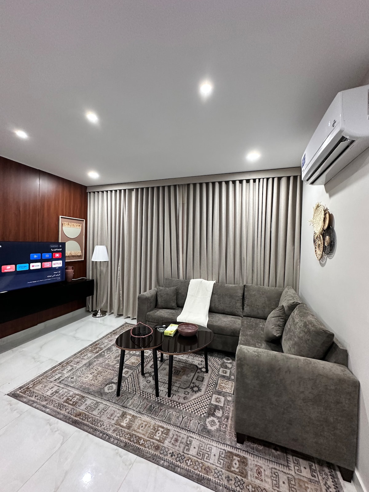 Kos deg med hele familien i denne elegante boligen. Moderne luksusleilighet * Designet og utstyrt for å finne din komfort * Det er to rom (masterrom og et rom med tre senger) En romslig stue åpen mot det moderne kjøkkenet Elegant design (Samsung Smart WiFi-skjerm) Fullt utstyrt kjøkken – Kjøleskap – Ovn + mikrobølgeovn + vaskemaskin – Alle kjøkkenutstyr er komplett – - Komfyr (gass/elektrisk) I tillegg til den spesielle beliggenheten 8 minutter med bil fra togstasjonen 10 minutter med bil fra flyplassen 5 minutter med bil fra Quba-moskeen 15 minutter med bil fra Profetens moské