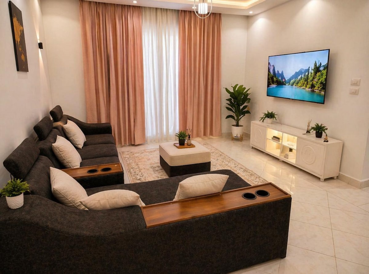 Opplev luksus i denne leiligheten med tre soverom i et sikret område døgnet rundt i New Cairo – 25 minutter fra flyplassen. Har et hovedsoverom, smart-TV-er, raskt trådløst nettverk og førsteklasses møbler med luksuriøst spisestuesett. Nyt felles bassenger, grøntområder og vakker utsikt. Nær de beste kjøpesentrene, kinoene, restaurantene og alt du trenger. Perfekt for familier eller bedriftsopphold. Bestill oppholdet ditt nå.