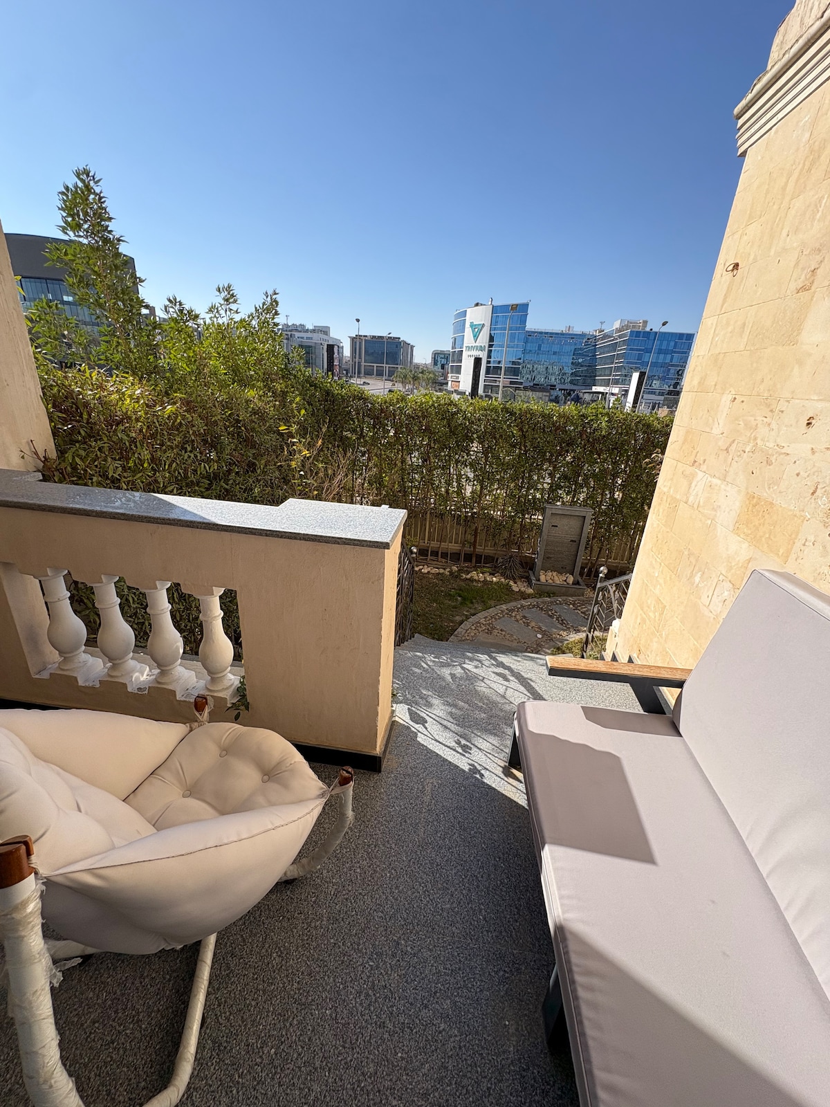 Oppdag denne nyoppussede, romslige og sjarmerende villaen med fem soverom på en førsteklasses beliggenhet, rett overfor 5A, U-Venues og Square One, og bare fem minutter fra Cairo Festival City Mall og Downtown Mall. Villaen har fire bad, et stort, fullt utstyrt kjøkken og en stor, vakker, privat hage med terrasse. Et av soverommene er en privat suite i en egen etasje med tilgang til et stort tak, som gir ekstra privatliv og plass. Ideell for familiegrupper.