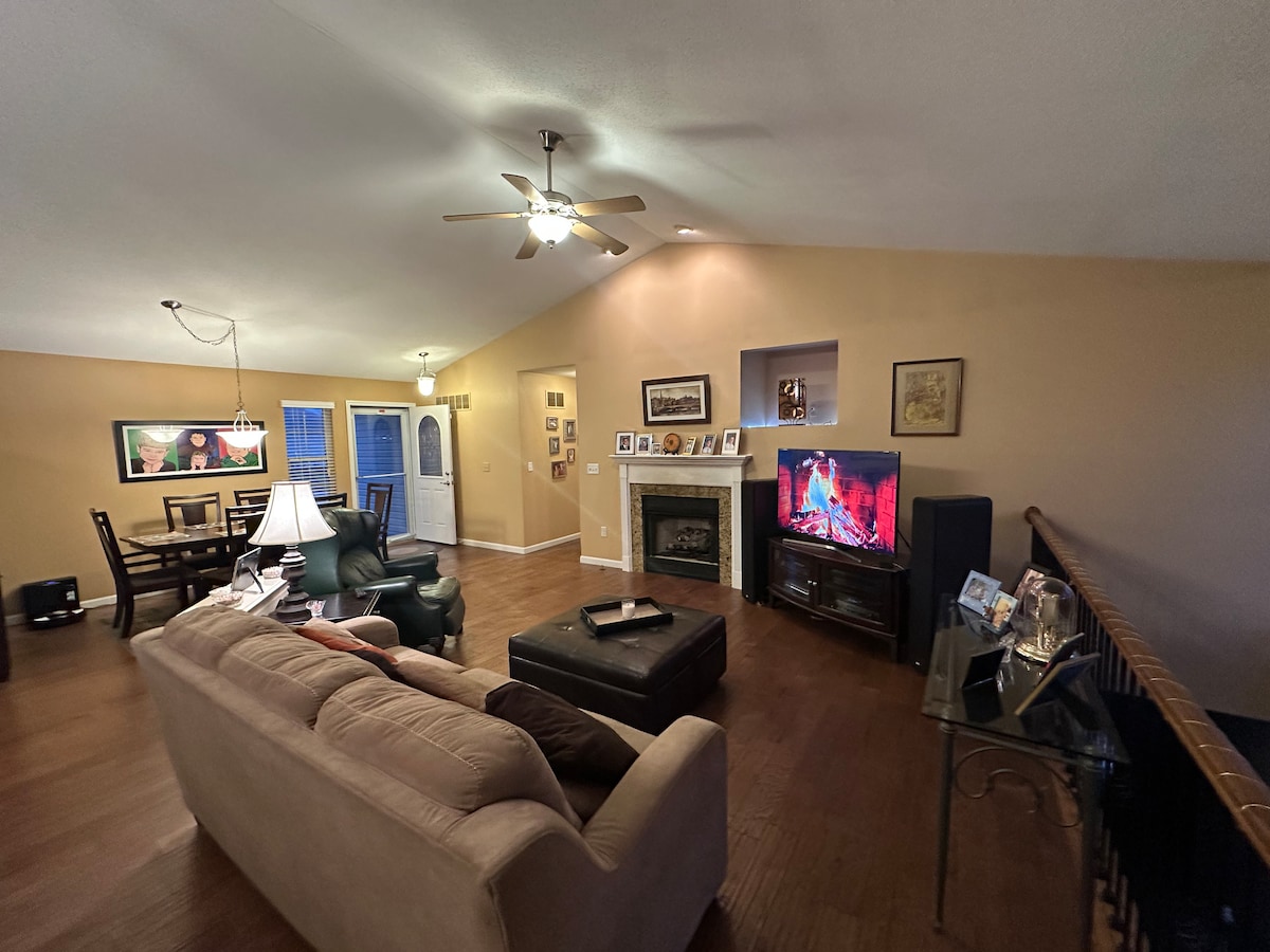 Velkommen til Hilltop Ranch Home! Du finner en avslappende ferie for hele familien eller flere par. Det er 1800 kvadratfot i første etasje, inkludert et hovedsoverom med eget bad med boblebad, et fullt utstyrt kjøkken, gasspeis og en tilknyttet garasje for to biler. I kjelleren er det et fjerde soverom, fullt bad og et TV-område. En uteplass ved siden av spisestuen, en kullgrill og boblebad i full størrelse – alt perfekt for å underholde hele gruppen.