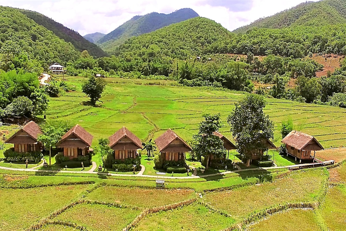 Vi holder det enkelt her. Én km fra gågaten i Pai. Fredelig beliggenhet bortgjemt fra all støyen. Stå opp med hanegal om morgenen med katt og hund som leker i hagen, gå i rismarken og mat kua med banan i løpet av dagen, og nyt et rolig solnedgang på ettermiddagen. Alle hyttene er utstyrt med aircondition og eget bad. Enkel frokost med toast, te og kaffe er tilgjengelig om morgenen.