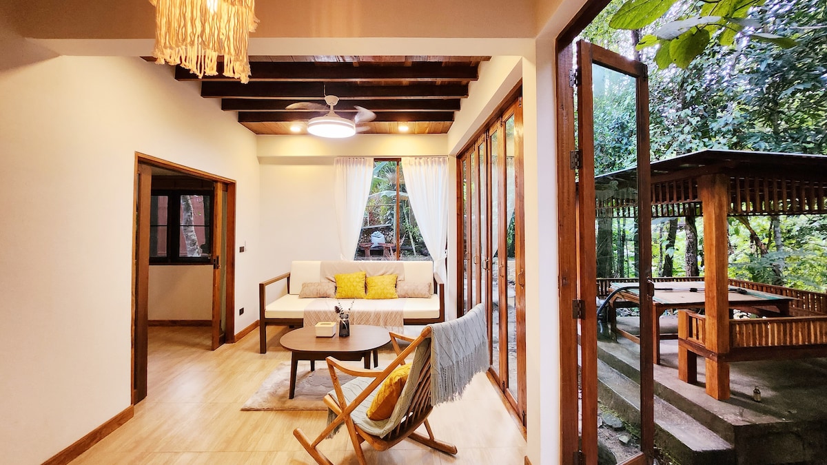 บ้านหลังใหญ่ที่มีความอบอุ่นอบอวลอยู่ทุกบริเวณของบ้าน โอบล้อมด้วยธรรมชาติที่จะเติมเต็มใจของคุณให้อิ่มเอมไปด้วยความสุข บริเวณชั้น 2 เป็นห้องนอนพร้อมเตาผิงและโซฟา มีระเบียงสำหรับนั่งฟังเสียงน้ำ ชมหมอกยามเช้า หรือดูดาวในตอนกลางคืน บริเวณชั้น 1 เป็นห้องนอน พื้นที่รับประทานอาหาร และมุมนั่งเล่น นอกจากนี้ยังมีสวนข้างบ้านและลานกิจกรรมก่อกองไฟริมลำธาร *ราคารวมอาหารเช้า และ welcome drinks & snacks แล้ว*