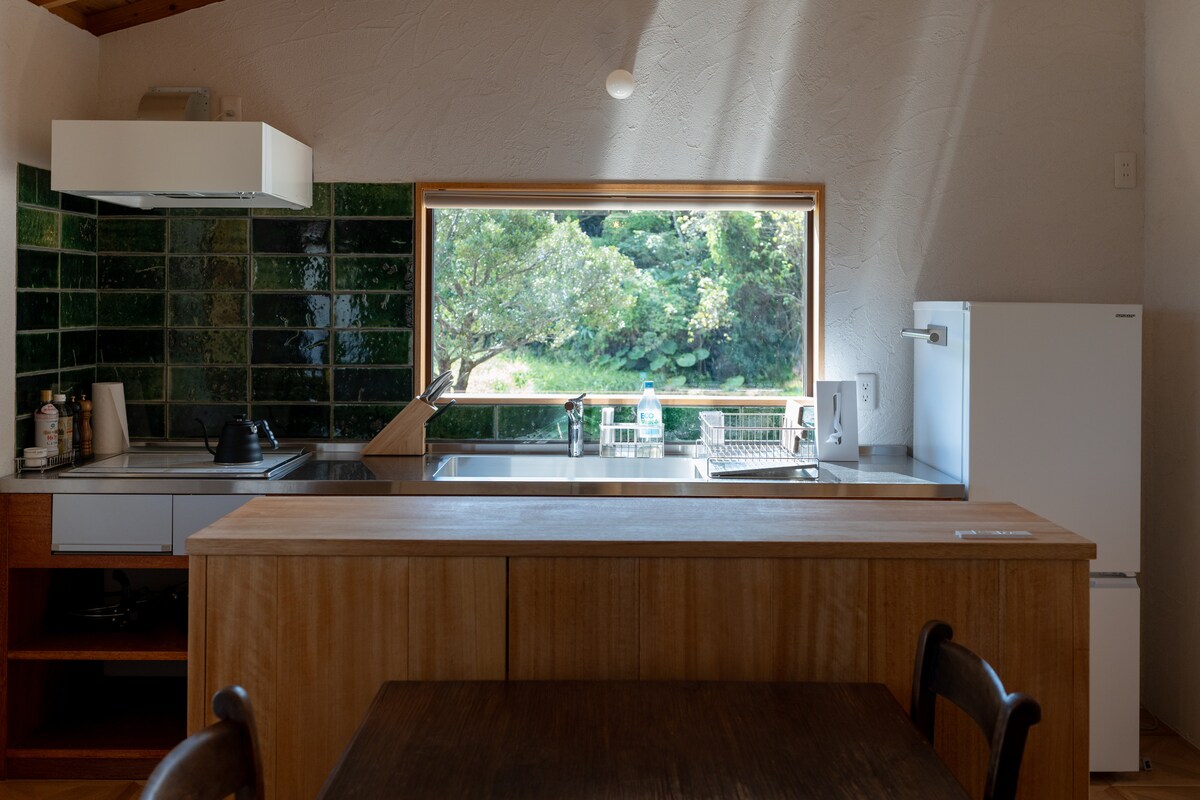Et nybygd hus som står på en klippe med 340 graders havutsikt i september 2022. Alle rom på ca. 100 kvadratmeter har havutsikt. Området som er tilgjengelig for gjester er overnattingsfasilitetene i andre etasje og grillterrassen på tredje etasje. Hvert rom har en TV på 50 tommer eller mer, og stuen har en 4K-projektor og en stor skjerm, slik at du kan se filmer. Det er en grillterrasse på taket som er forbundet med en utvendig trapp, og du kan nyte soloppgangen, havutsikten om dagen, soloppgangen om kvelden, nattutsikten, stjernehimmelen og månen. Du vil bli beroliget av utsikten over havet og naturen. Takterrassen er fullt utstyrt med toalett, kjøkken og vaskerom. Det er åtte stikkontakter, og det er også mulig å lage mat med IH. De to soverommene har to dobbeltsenger hver, og kan ta imot opptil 8 personer. Sofaen i stuen har også plass til en enkeltseng. Det anbefales for par, ektepar, familier og reiser med tre generasjoner. Området er veldig stille, og om natten kan du høre insekter, uglelyder og lyden av bølger hvis du lytter nøye. Det er en undervannsvei 10 minutter unna med bil, og det er også anbefalt som en base for marineaktiviteter.