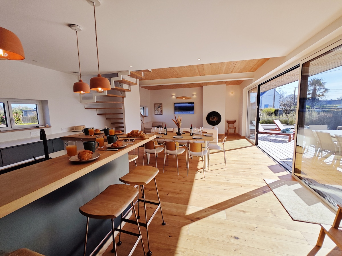 Enten du er på jobb eller på ferie for å oppdage Bretagne, vil du bli henrykt over vår ideelt beliggende hytte -Komfort: Lys, romslig, 5 store soverom, 2 bad + 2 toaletter i første etasje + i andre etasje, 500 m2 privat parkering med asfalt for alle kjøretøy - Natura 2000-området: Rolig, på landet Fiske 1 km Plen 1000 m2 Trampoline, bowling, spill Original terrasse Sommerkjøkken med grill Nær strender og festivaler Babyvennlig Hunder tillatt