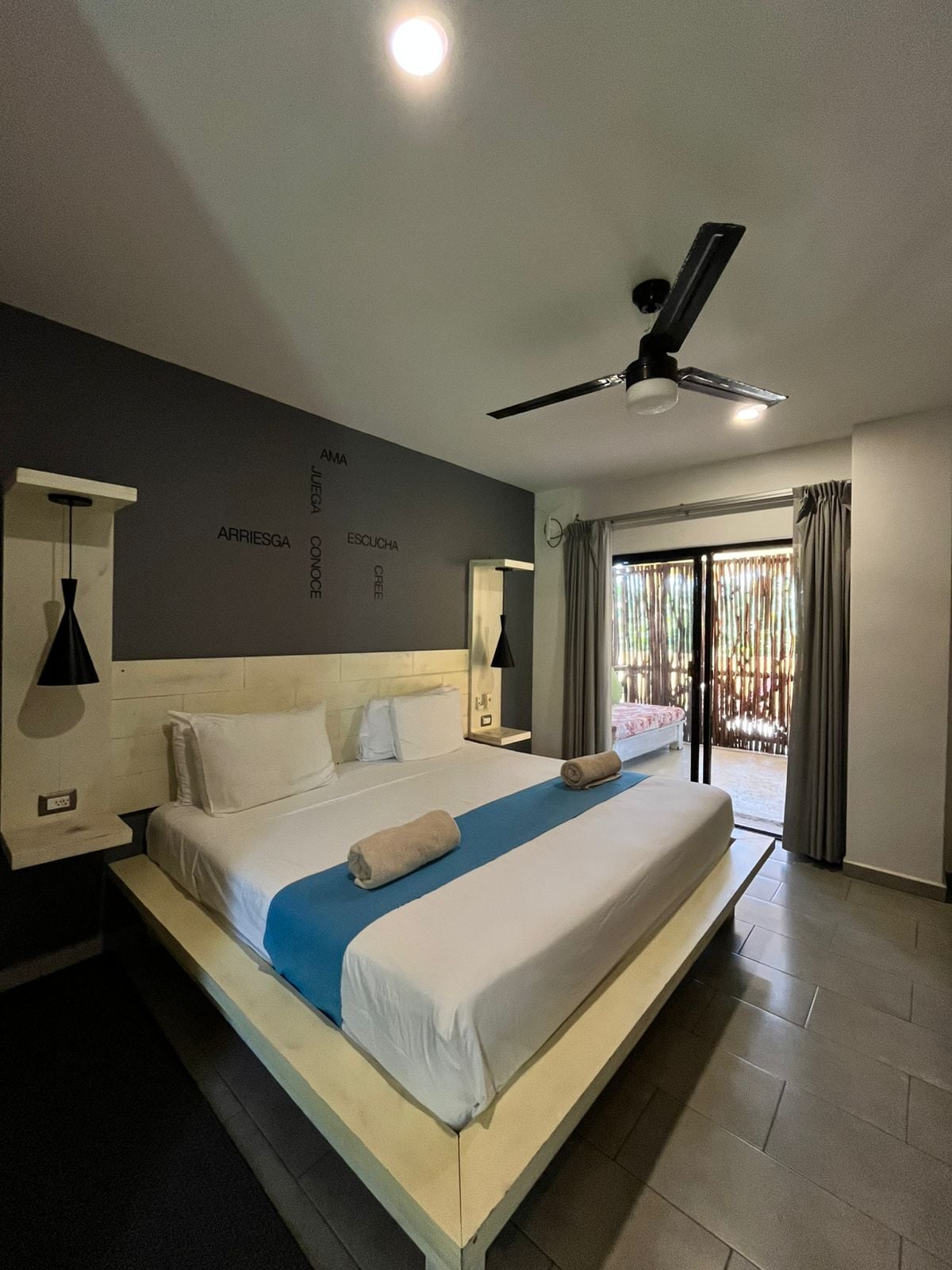 Comfortable and quiet room in new beachfront hotel, with access to the best Beach Club in Mahahual. The best beach front location for a good price. King size bed with 4 large and soft pillows, spacious rain shower, amenities, WiFi, Cable TV, Netflix, air conditioning, ceiling fan, minibar, work desk. NO VIEW (courtyard inside view).