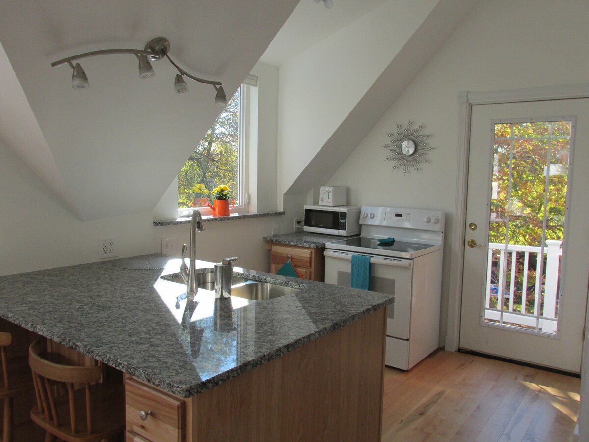 Lyst, koselig loft, omgitt av dype skoger, et rolig tilfluktssted som tilbyr ekte fred, atskilt fra hjemmet vårt, med egen inngang. Vi er her hvis det er nødvendig. Ligger mellom Boothbay, Damariscotta og Wiscasset, 1,6 km fra rute 1 og 27, på 13 hektar, som støter opp til 100 hektar med naturreservat – gir det beste fra to verdener – skog rik på fugler, men mindre enn 15 minutter fra restauranter, butikker og aktiviteter, pluss dedikert trådløst nettverk/to smart-TV-er. Hunder er velkomne, ingen katter på grunn av allergi.