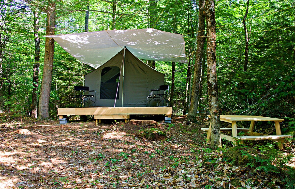 Eventyr venter på deg i vår rustikke ferie som heter "The View", et sjeldent perspektiv på Presidential Range og White Mountains i New Hampshire i hjertet av Maine 's Lakes Region. Denne campingplassen har et Bell Tent med queen-seng og en utendørs samlings Safari-paviljong med grill, bålplass, hengende soldusj og komposteringstoalett. Vi befinner oss i Stoneham i Maine (25 minutter fra Fryeburg Faire). Opptil to ekstra enkeltsenger kan legges til på forespørsel, eller du har muligheten til å ta med ditt eget telt.