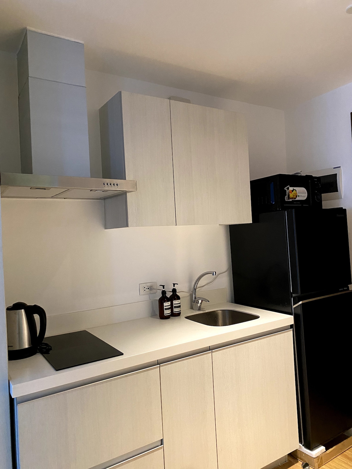 Enhet med ett soverom på Milano Residences. To klimaanlegg/røykebalkong og et komplett kjøkken. Dette ettromsleiligheten er superkoselig og et flott sted å underholde samtidig. Så komfortabelt, det er virkelig hjemme! Det felles bassenget og badstuen nede er tilgjengelig tirsdag til søndag, kl. 07.00 til 19.00. Bassenget er stengt på rengjøringsdagen (mandag). Parkering er ved Century City Mall ved siden av. Superpraktisk og 24 timer.