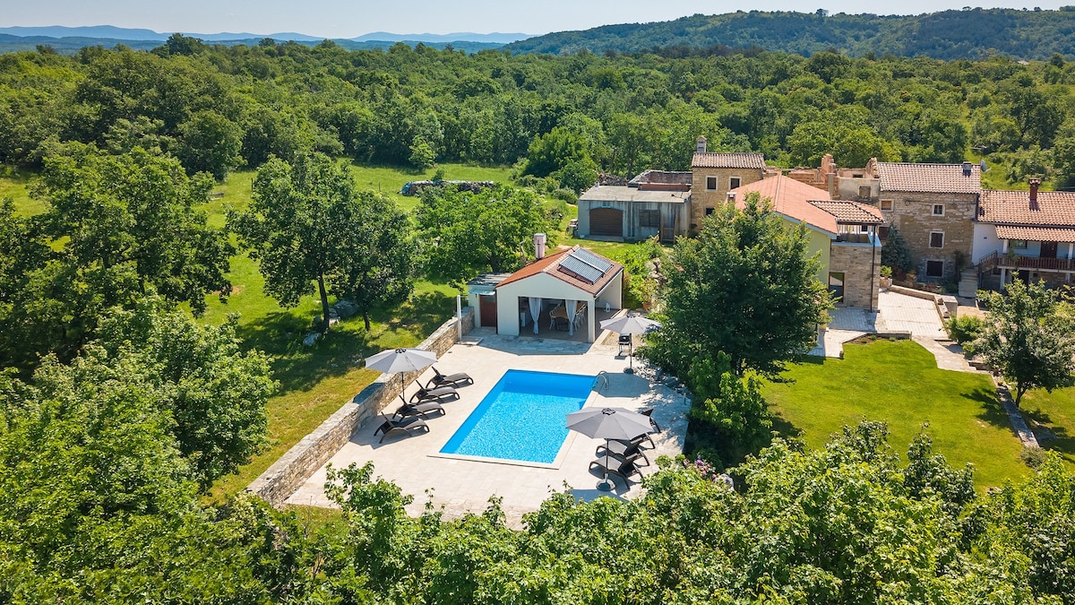 Beliggende på en avsidesliggende plass, er det et ideelt tilfluktssted for dem som søker fullstendig avslapning i naturlige omgivelser. Likevel ligger det perfekt til i nærheten av de mest populære stedene – historiske byer, strender, de beste restaurantene og vingårdene i nordvestlige Istria. Kjernen i eiendommen er et grundig renovert steinhus som ligger i det kuperte landskapet, med moderne interiør, et 12 meter langt svømmebasseng og et observasjonsdekk på taket.