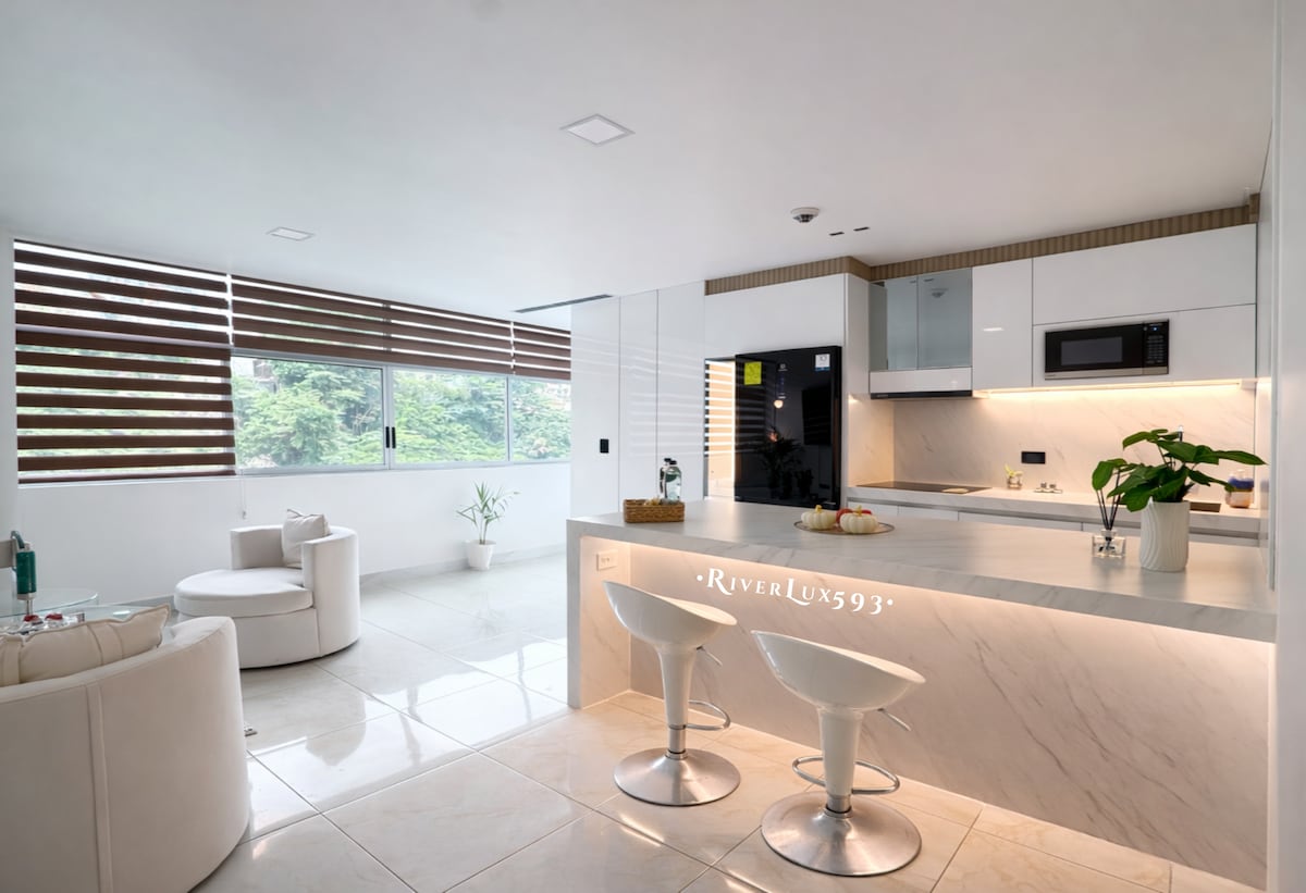 Velkommen til den luksuriøse suiten vår, som ligger minutter fra flyplassen, i Puerto Santa Ana, det tryggeste området i Guayaquil, hvor du kan gå fritt. Her kan du nyte en eksepsjonell utsikt over elven og den moderne boulevarden, noe som skaper en avslappende og eksklusiv atmosfære fra det øyeblikket du kommer inn. Hovedtrekket er det utrolige luksuriøse designet og den doble utsikten over elven fra rommet. Både stuen og soverommet har smart-TV-er.