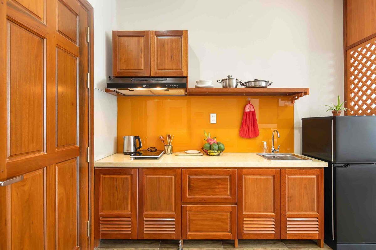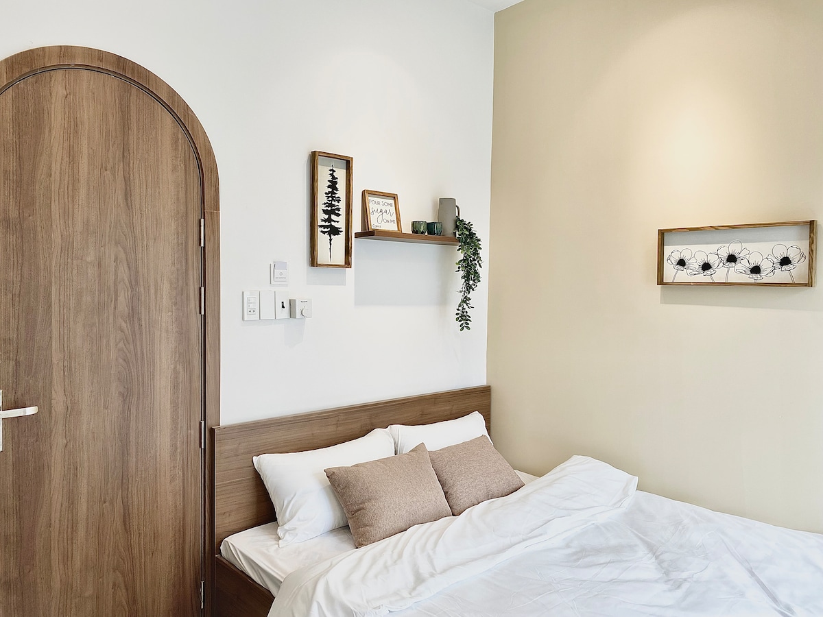 Denne luksuriøse leiligheten tilbyr et separat soverom og fullt kjøkken, bare 500 meter fra My Khe Beach, som er det perfekte stedet for ferien din. Leiligheten er en del av en søt liten villa på tre nivåer. Som en del av den unike sjarmen finner du trapper i stedet for en heis – en liten detalj som gjør at villaen føles enda mer hjemmekoselig og imøtekommende. Med slagordet "May Home is where the heart is" kommer du alltid til å føle deg hjertelig velkommen av teamet vårt, med et opphold som er komfortabelt og uforglemmelig.