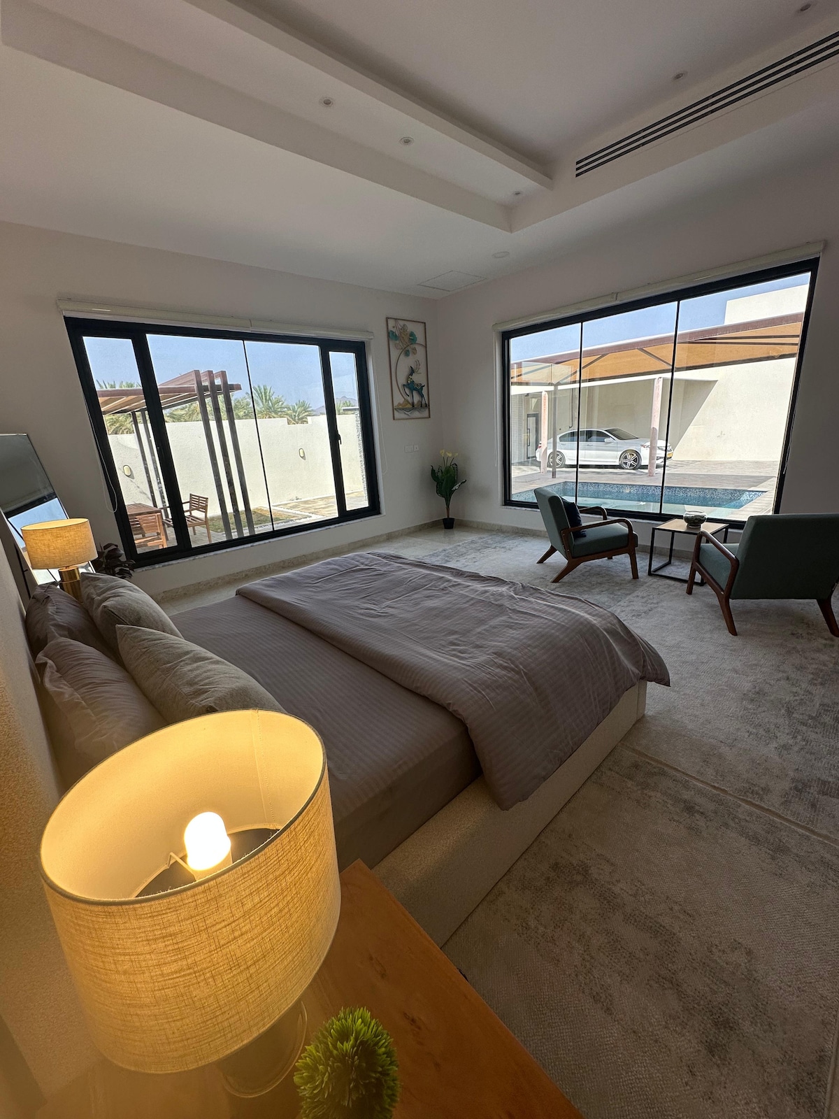 Hytta ligger i et rolig område i Nizwa, ca. 12 minutter fra Nizwa sentrum. Beliggenheten er rolig og avslappende. Hytta har kjøkken med kaffe, matlagingsutstyr, mikrobølgeovn og varmtvannsbereder. Det er privatliv på parkeringsplassene og i hytta. Innsjekking uten vert er tilgjengelig døgnet rundt. Du får innsjekkingsinstruksjonene og tilgangskoden til porten 24 timer før ankomst.