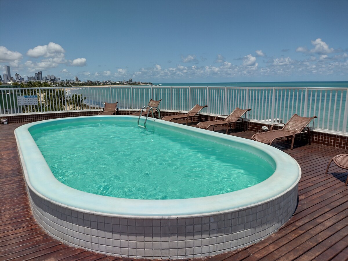 Slapp av med familien i denne rolige boligen, med havutsikt, basseng med havutsikt, døgnåpen resepsjon, med bekvemmeligheten av å ha all lokal og turisthandel i nærheten av deg, messer, barer, restauranter, lancherias, bakeri, marked, shopping, strand. Kom og nyt skjønnheten i den vakre byen João Pessoa. Dagsprisen tilsvarer ett par og ett barn opptil 12 år. Merknader: Ved lengre opphold kan energien i perioden belastes, siden vi har 02 ares på stedet.