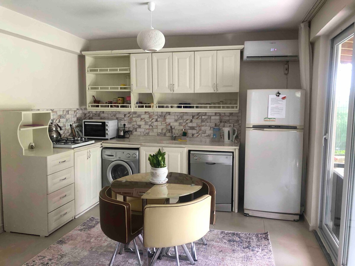 Strandleilighet. Strandstranden ligger 50 meter unna. Det ligger i sentrum av kysten. Huset har plass til fem personer. Kjøkkenet er fullt,parkering, i nærheten av dagligvarebutikken i det fredelige området, 900 meter til den gamle stranden, midt mellom femstjerners hoteller. I nærheten av Dolmus og bussapoteker. 2 +1 leiligheter.