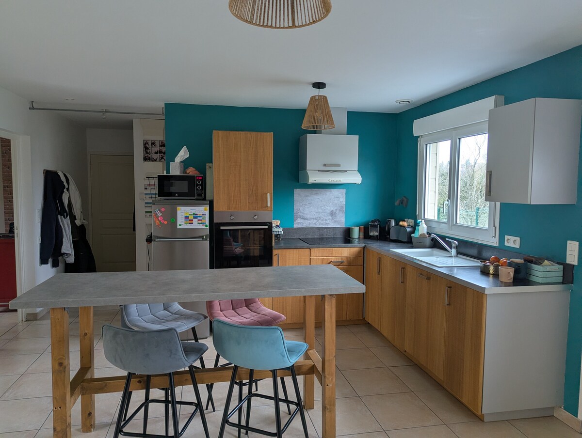 Kom og lad opp batteriene i dette familiehjemmet som en gang var en poststasjon. Et steinkast fra Balleroy slott og butikker, vil du nyte 100 m2 overutstyrt og grønne omgivelser som vil gi deg mykhet og ro. Koselig atmosfære i den første stuen med peis, bøker, TV. Utsikt over skogen og kirken. Kontorhjørne. Privat hage med treningsrom. Ideelt for et par. Mulighet for å legge til en seng for en person.