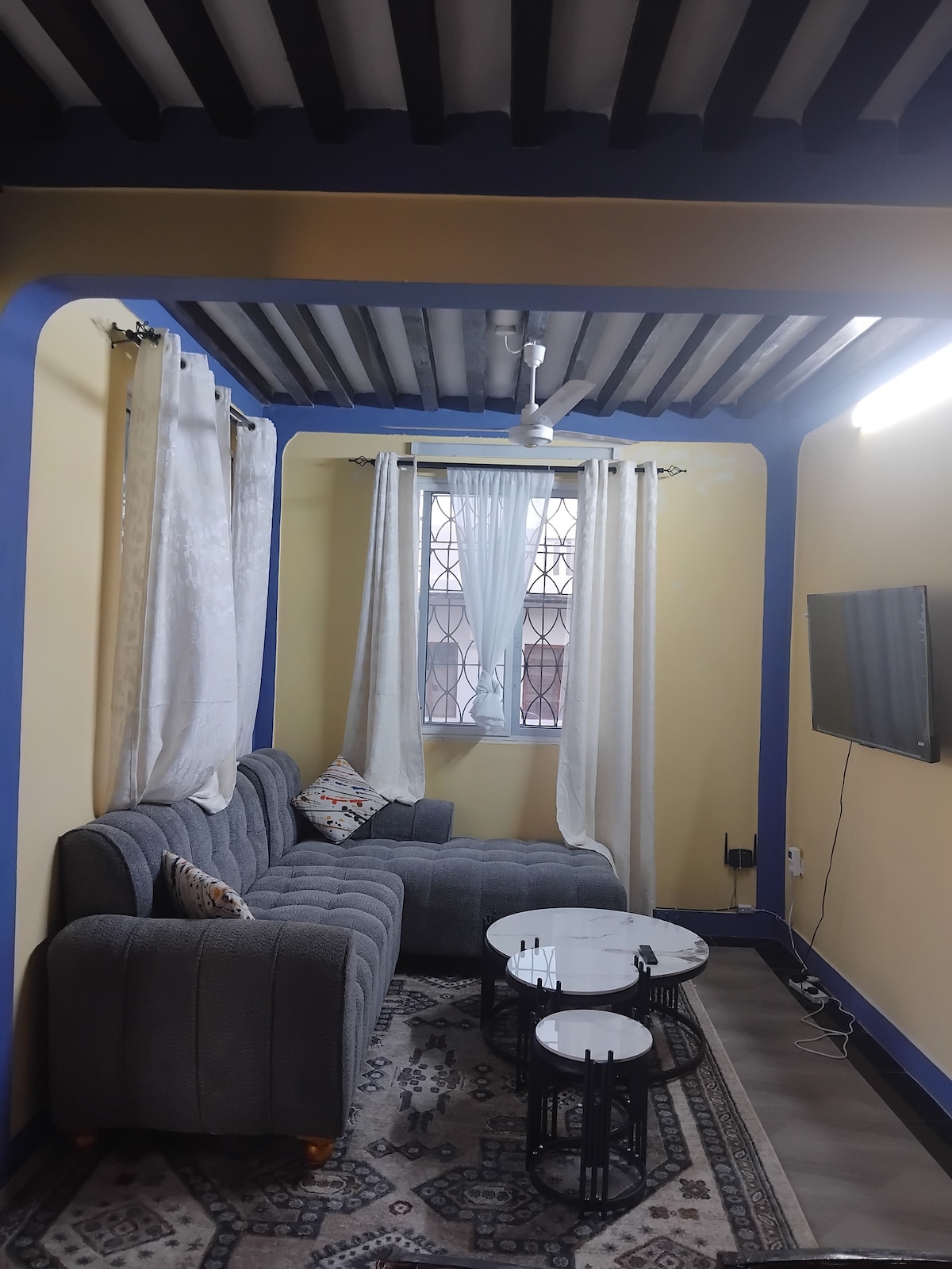 Velkommen til din perfekte ferie! Vår sjarmerende eiendom ligger bare tre minutters gange fra strandpromenaden, i hjertet av Lamu, og tilbyr en unik blanding av komfort og lokal kultur. Med et romslig rom med en fantastisk utsikt over havet. Nyt moderne fasiliteter, inkludert gratis Wi-Fi, et fullt utstyrt kjøkken og en koselig stue. Ta en spasertur til de vakre strendene på øya. Enten du ønsker å slappe av, jobbe eller utforske byen, er eiendommen vår den ideelle basen for eventyrene dine.