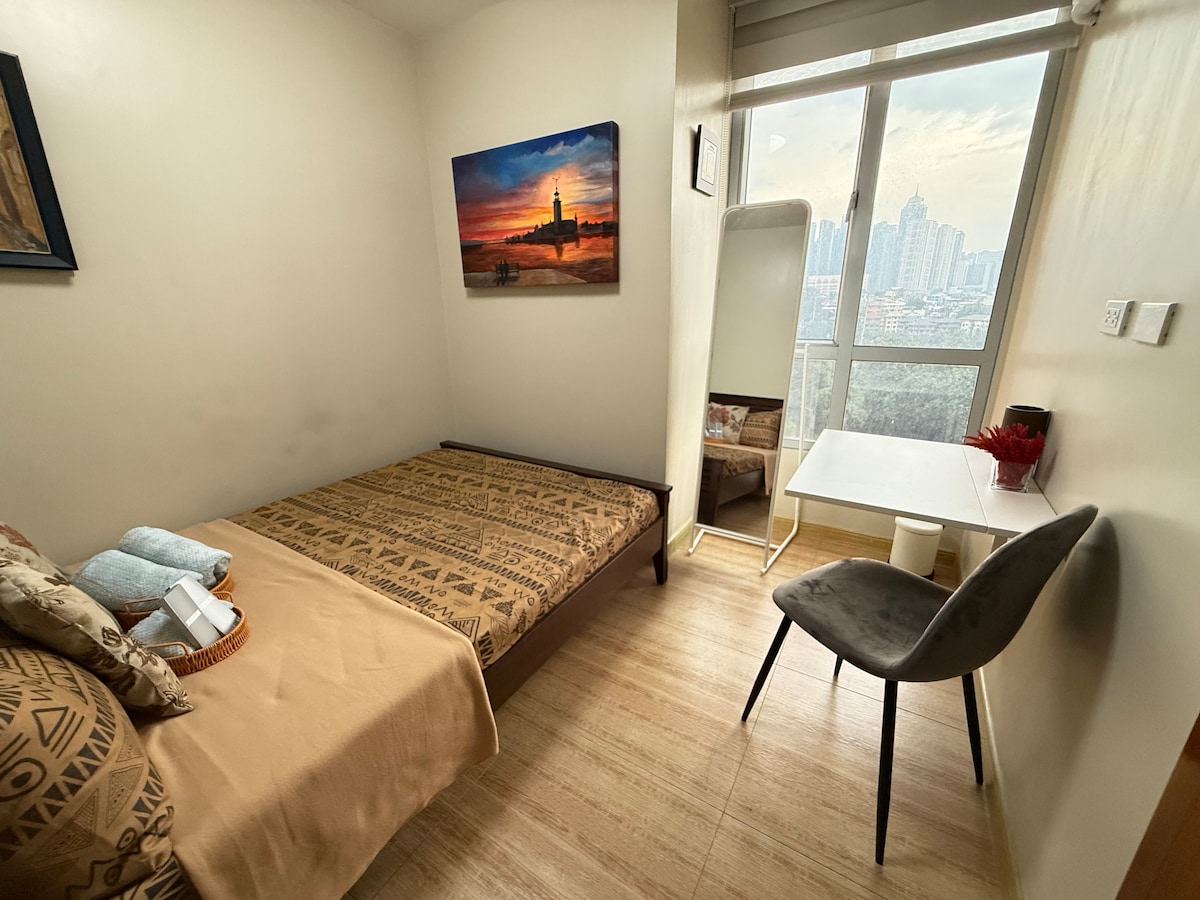 Velkommen, kjære gjest! Stedet har en liten balkong og er utstyrt med trådløst nettverk og kabel-TV. Når du har bestilt, sender du en kopi av gyldig legitimasjon via e-post, Viber eller chatboksen. Parkering er tilgjengelig i bygningens kjeller. Prisene er som følger: 50 PHP for de første tre timene og 30 PHP for hver ekstra time. Vær oppmerksom på at det er et ekstra parkeringsgebyr på 200 ₱ over natten hvis du parkerer etter kl. 02.00 for neste dag. Enheten har plass til maksimalt to voksne og én mindreårig.