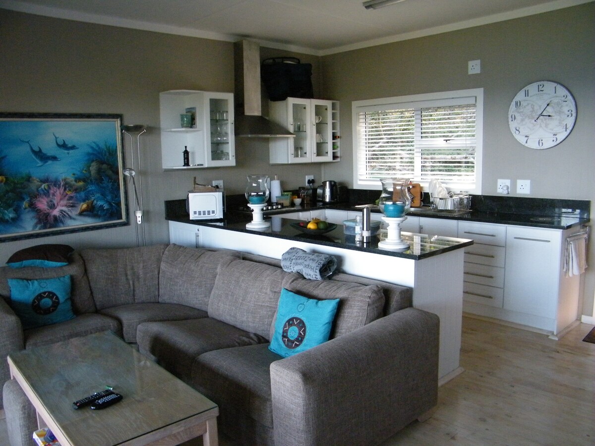 Ta det med ro på denne unike og rolige utflukten. Med en av de beste utsiktene, fredelig, møblert og bygget på detaljer, foran stranden , kan du sove med lyden av havet og komforten du fortjener. Vakkert innredet og fullt utstyrt hus med Starlink internett, klimaanlegg på alle områder, smart-TV, Marshall Sound, JBL bærbar høyttaler , kjøleskap, mikrobølgeovn, vaskemaskin, Delta-kaffemaskin, Airfryer, Gas Braai, to terrasser møblert, huske og bord på terrassen,