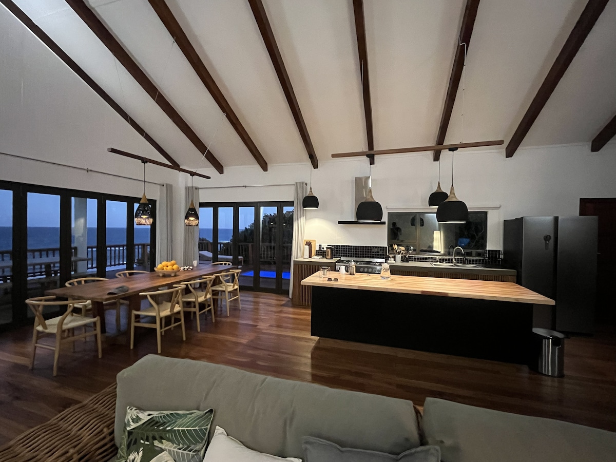 Alle fire soverommene har eget bad og takvifter. To soverom har queen-senger, det tredje soverommet har tre enkeltsenger og det fjerde soverommet har en queen XL-seng og en enkel uttrekkbar seng for et barn. Ubegrenset STARLINK WI-FI – TV-strømming og et fullt utstyrt kjøkken med ismaskin og vaskemaskin. Trygt på hovedsoverommet. Privat basseng, lenestoler og hengekøyer. Avsides braai-område. Sikkerhet døgnet rundt, daglig rengjøring. Kort spasertur til restauranten og baren MozBevok på eiendommen. 180° havutsikt