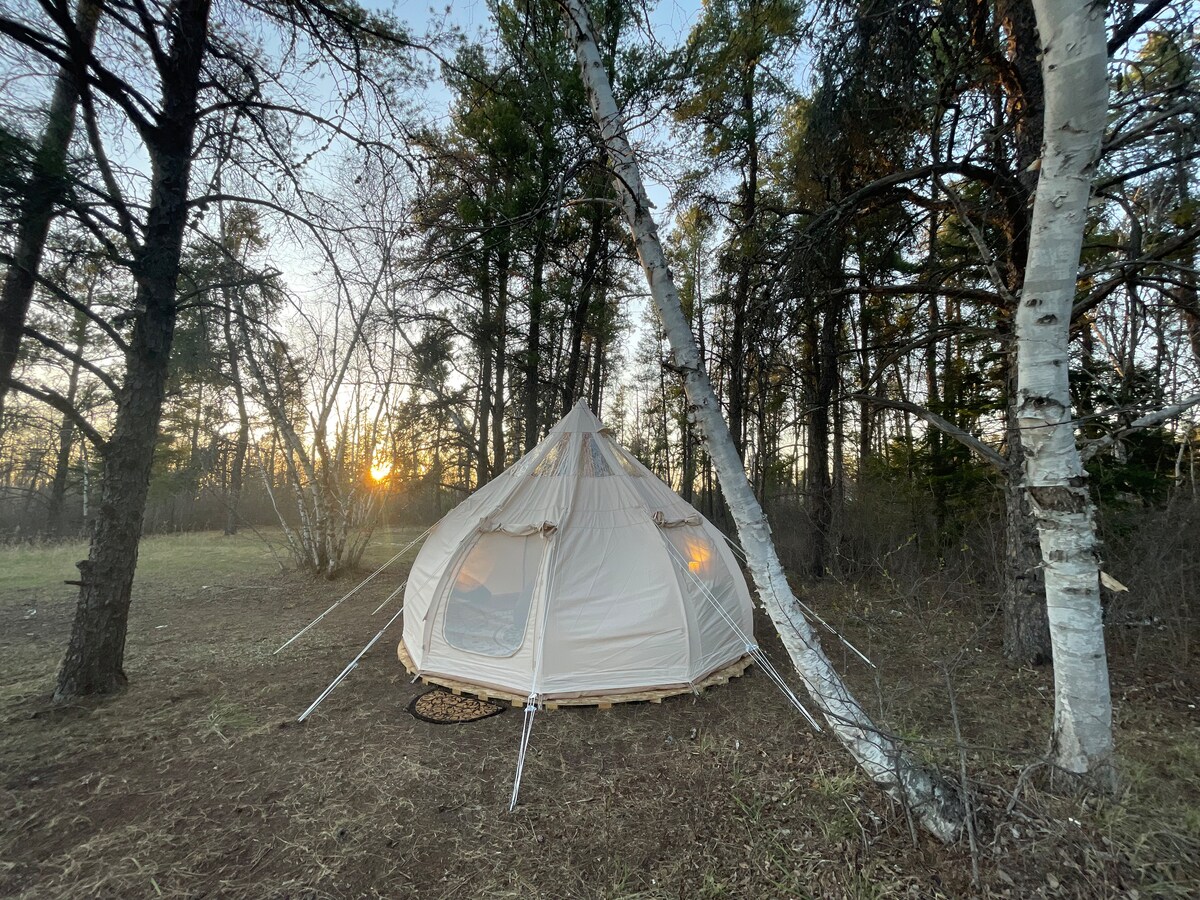 Denne lerretenheten ligger på en bakketopp blant eik, furu og bjørk, og gir alle bekvemmelighetene til en rustikk hytte med følelsen av et campingeventyr. Inkluderer tilgang til felles brygge, turstier, vedfyrt badstue, sedertredusj og bruk av kanoer, kajakker og SUP-er. Teltet vårt i campingstil er uoppvarmet, og gjestene tilbyr puter, sesong passende sengetøy og håndklær. Vårt øko-resort som har følelsen av en villmarksferie, men som likevel ligger mindre enn 15 minutter fra restaurantene og butikkene i sentrum av Kenora.