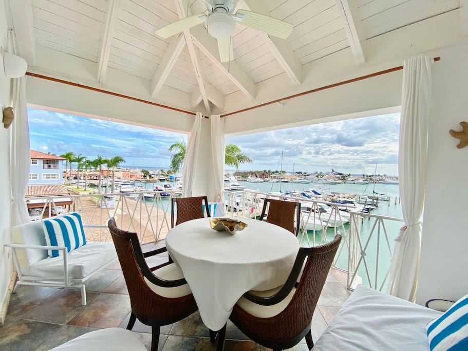 Fishing Lodge er hjertet av Cap Cana og dens fantastiske spisemuligheter. Denne vakkert renoverte studioleiligheten/leiligheten med ett soverom har en fantastisk utsikt over: bukten, inngangen til marinaen, den store yachtparkeringen, fiskehyttegården og konsertarenaen. Leiligheten er møblert med en king size-seng og en uttrekkbar sovesofa. På kjøkkenet har den et kjøleskap i full størrelse (ikke en minikjøleskap som de fleste andre enheter) og en vaskemaskin/tørketrommel.