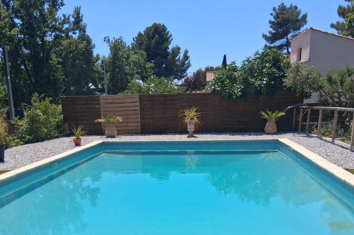 🌿 Minivilla på 40 kvm for 2 til 4 personer, bohemsk, elegant Bali-dekor, i hjertet av Provence. Soverom, moderne bad, utstyrt kjøkken, klimaanlegg, TV med Netflix, hagemøbler. Full panoramautsikt mot Sainte-Victoire-fjellet. Tilgang til svømmebassenget og jacuzzien i felles tidsrom. Et fristed med ro og fred, perfekt for å slappe av mens du bor i nærheten av Aix-en-Provence.