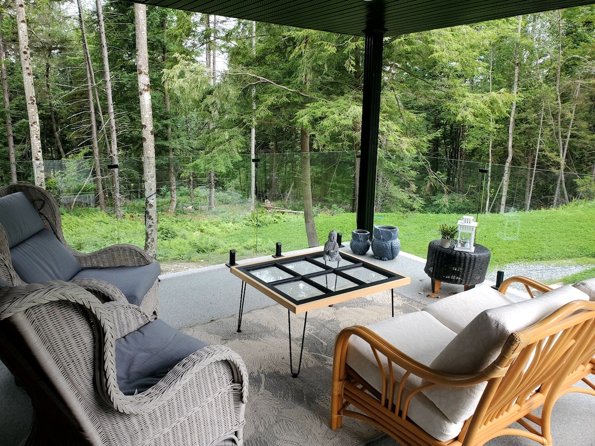 Monumental open concept, in the heart of nature. Access to trails directly behind the house. Wood stove, large modern bathroom, one bedroom + sofa bed. Another sofa bed in the living room. Ideal chalet for a couple with children or two couples. Wild birds, turkey, and deer lovers welcome! Wifi and EV charger included. Dogs Welcome! CITQ : #308038