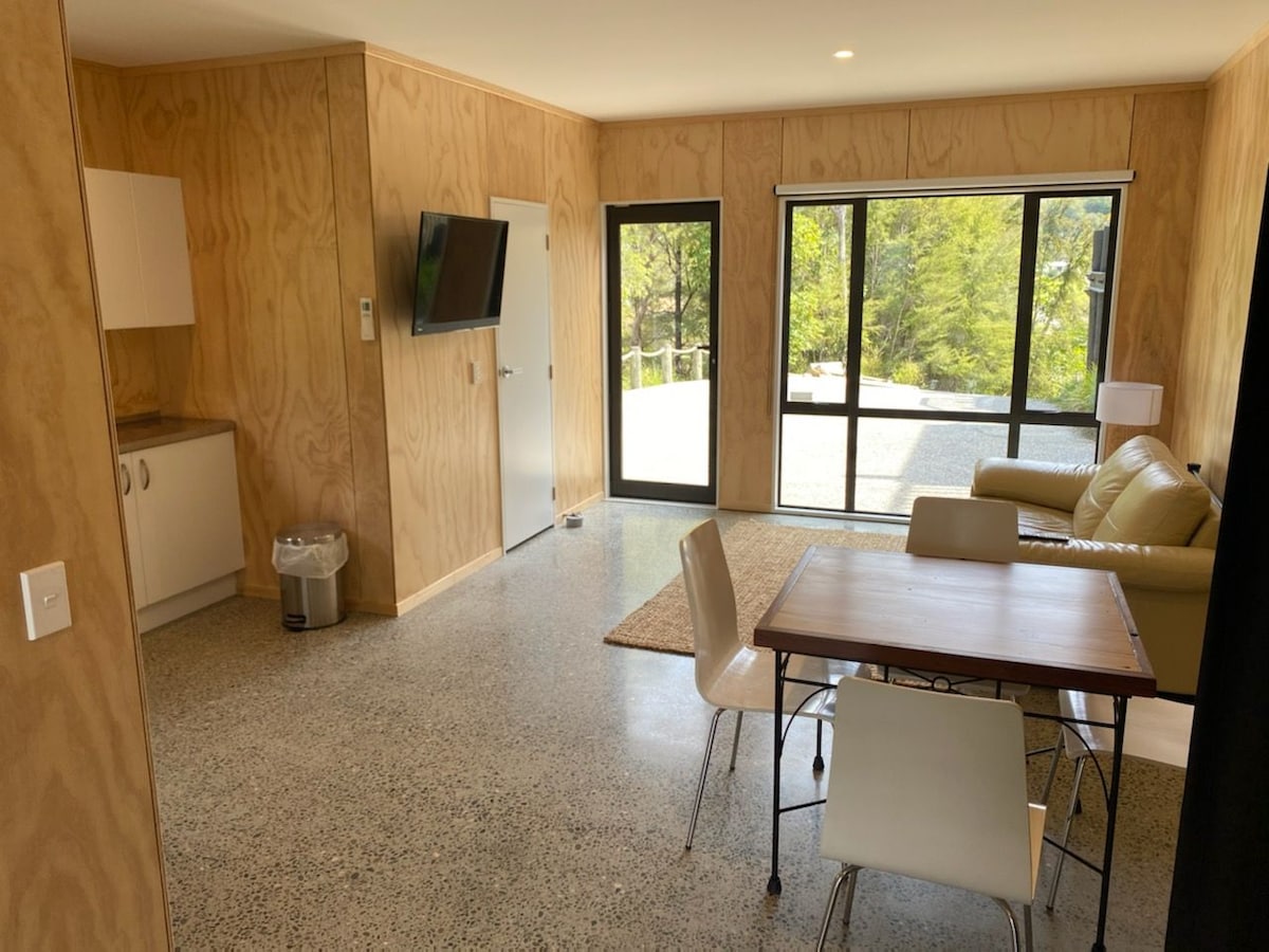 Plassert i bushen og helt separat/privat fra hovedboligen finner du en nylig ombygd enhet. Moderne, fullt isolert, doble vinduer og en koselig varmepumpe. Egen inngang, egen gårdsplass og uteområde under tak. Ti minutters gange til Kaiteriteri-stranden, terrengsykkelparken og den fantastiske Abel Tasman nasjonalpark rett utenfor døren din. Lytt til fuglesang i den fantastiske innfødte bushen, nyt utsikten over elvemunningen ned til Kaiteriteri Beach. Stol på oss, du har ikke lyst til å dra!