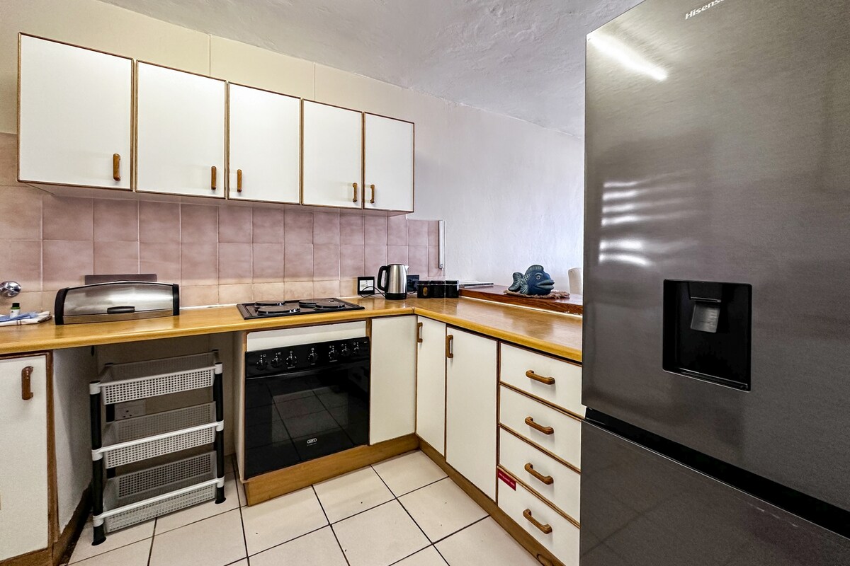 Plassert i den rolige landsbyen Southbroom. Fem minutters gange fra stranden. Koselig stue med smart-TV og HDMI-kabel for å spille av Netflix (ved hjelp av din egen pålogging), Youtube (tilgjengelig) og surfe på internett. Tekjøkken, spiseplass, dusj og romslig soverom med super kingsize-seng og fantastisk havutsikt. Sikkerhet med væpnet respons. 5000 liters JOJO-tank for vannreserve. Omformer og solcellepaneler for strømforsyning. Lastdeling og vannskifte påvirker deg ikke. Låsbar garasje.