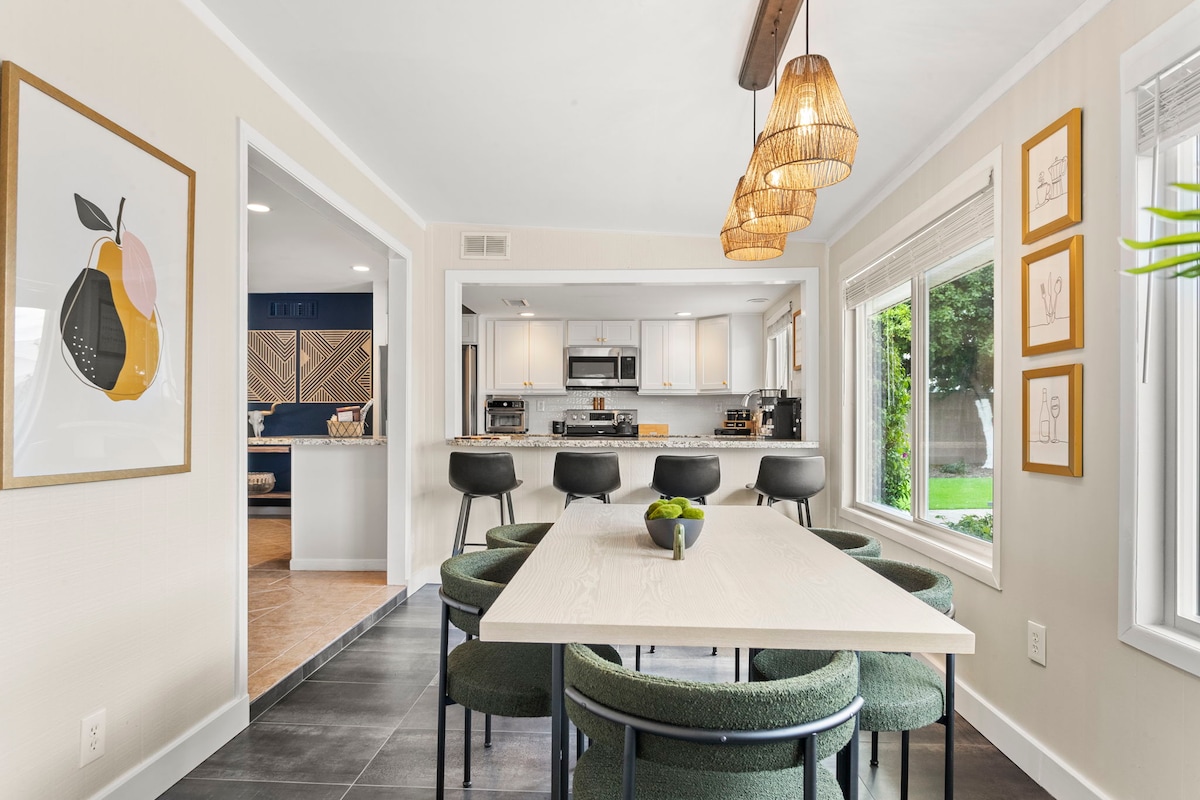 🏊 Oppvarmet basseng, 🎯 corn hole og 🎱 biljardbord for moro skyld. 🏜️ Velkommen til dette stilige moderne ørkenhjemmet fra midten av århundret med fire soverom! ☕ Brygg kaffe på det åpne kjøkkenet og nyt den solfylte bakgården med gressplen. 🔥 Tenn opp grillen mens alle slapper av ✨ Romslig, plettfritt og fullpakket med komfort – bestill oppholdet ditt i Arizona nå!