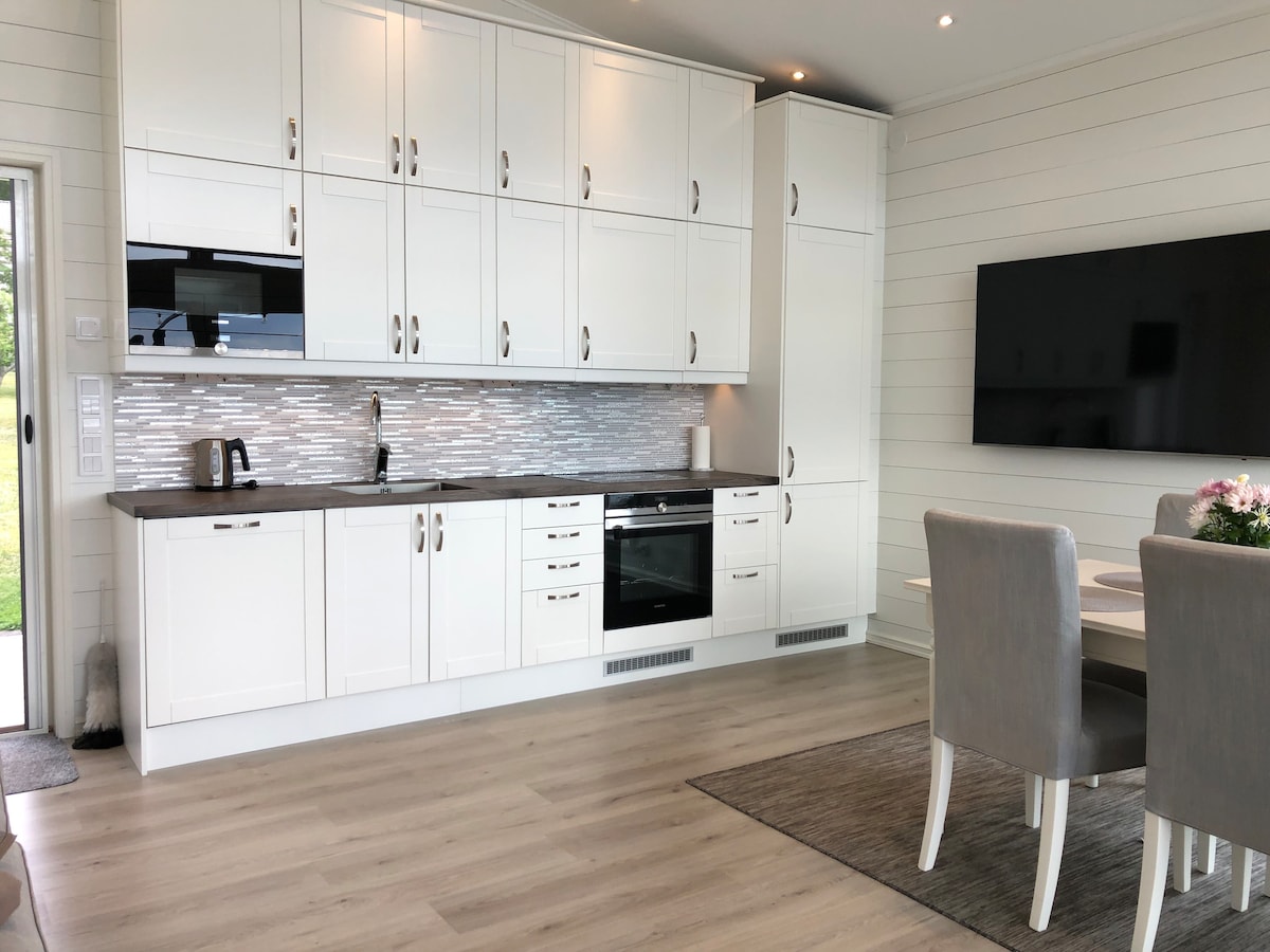 Velkommen til vår moderne hytte ved sjøen. Her finner du alt du trenger for et rolig og avslappende opphold. Hytta, ca. 50 m2, har et velutstyrt kjøkken/stue, et lite soverom med 160 cm dobbeltseng, romslig bad med toalett og dusj, samt badstue og boblebad. Sol fra morgen til kveld og fin utsikt over stranden og havet. Private, sjenerøse og oppholdsvennlige balkonger strekker seg rundt hytta. Du har fri tilgang til stranden og bryggen med badestige. Hytta ligger ca. 5 km fra Mariehamn.
