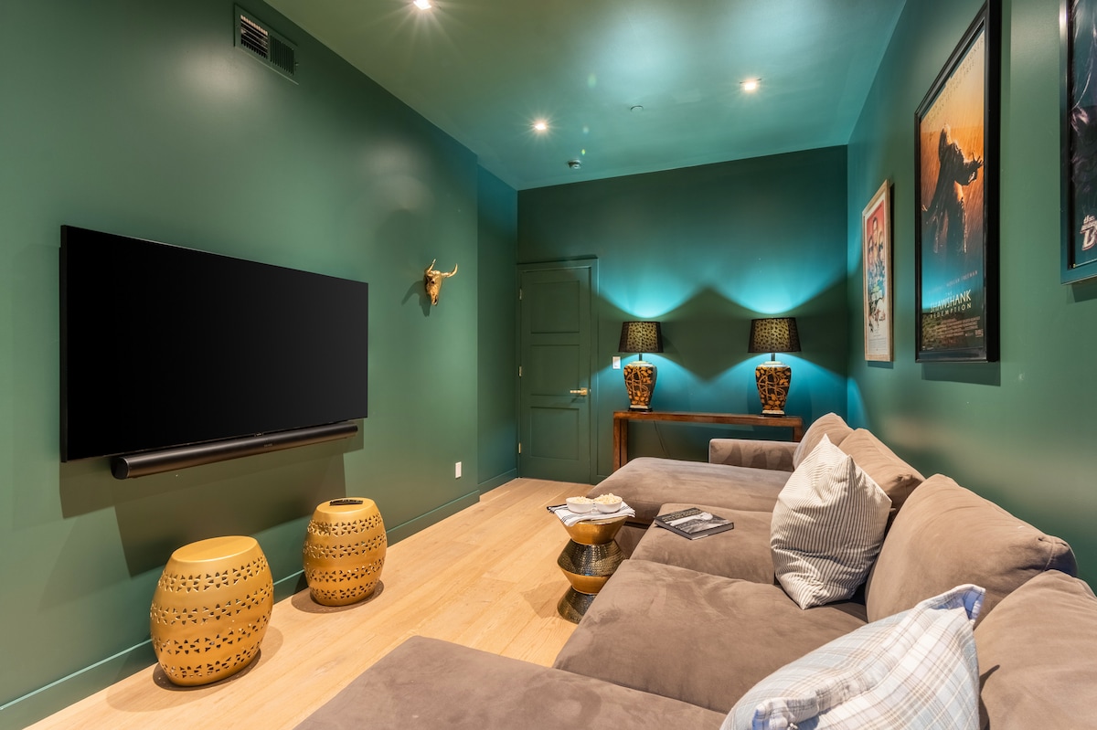 Et treetasjes tilfluktssted med panoramautsikt over Sausalito Harbor, sentrum (10–15 minutters gange) og havet. Full utsikt fra de todelte dørene som er åpne til en romslig terrasse med utendørs varme. Hjemmet er designet for arbeid og underholdning, og har et dedikert kontor med doble ultrabredde skjermer og flere teateroppsett, inkludert 8K-projektorer, Sonos Dolby Atmos, subwoofere og en 85" Quantum Dot-TV. Hovedsoverommet har en California king Tempur-Pedic, privat balkong og teater.