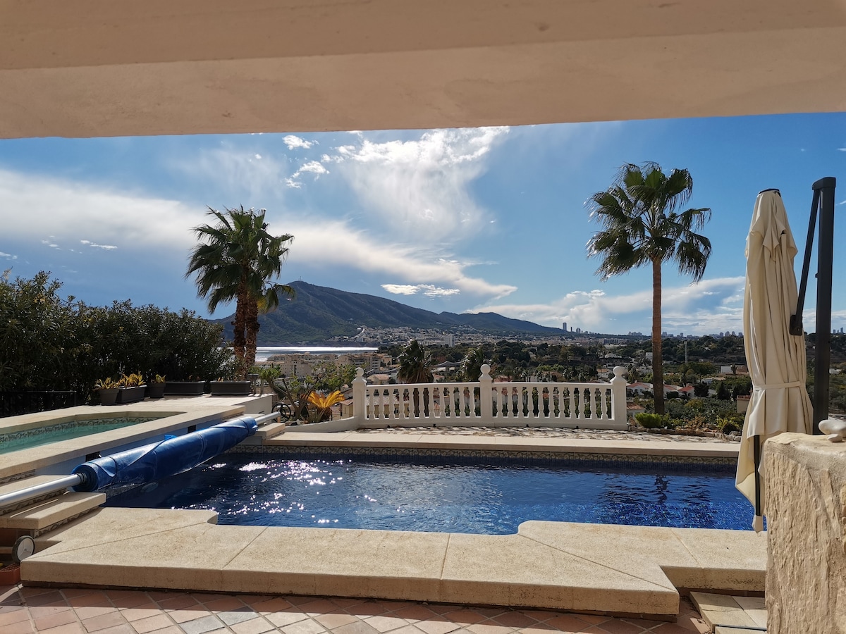 Stille middelhavshus med fantastisk utsikt, oppvarmet svømmebasseng, ni minutters gange til den fantastiske hvite gamlebyen Altea. 15 minutters gange ned til sjøen. Privat etasje for gjestene, med spisestue, tre soverom og to bad. Stor privat terrasse, utemøbler, gassgrill, hage med et vakkert furutre og bred utsikt. Oppvarmet basseng, med separat terrasse, privat bruk kun gjest og eier, fortrinnsvis for gjesten. Eierne bor i øverste etasje, med andre terrasser.