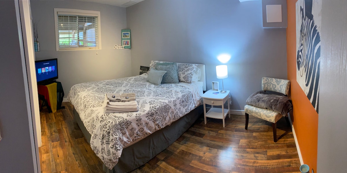 Keep it simple at this peaceful and centrally located place near most amenities. Tucked away right off of the Kingsway, you are only a 5 minute drive to the Downtown core and most retail amenities. This in law suite will provide you with a private and cozy stay. The unit features a kitchenette with a mini fridge, oven/stove, microwave, toaster, and Keurig. It also includes a bathroom, double bed, TV and Wifi. THIS UNIT IS ENTIRELY PRIVATE (Studio sized) and features self check in at any time.