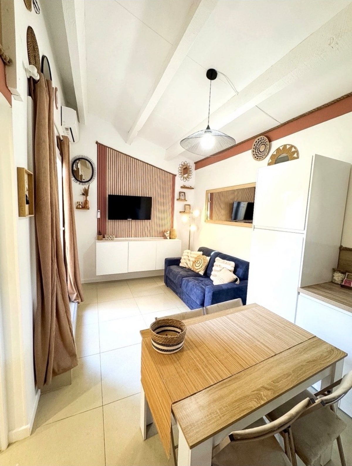 Leilighet T2 hytte i første etasje, stor skyggefull terrasse, ikke oversett + veranda. En reservert parkeringsplass i lukket parkering. Dobbeltseng med ett soverom, en hyttekøyesenger, én BZ. Om vinteren er det noen butikker som er åpne i skoleferien. Stue, kjøkkenområde: kaffemaskin med filter, vannkoker, mikrobølgeovn, induksjonstopp, kjøleskap på toppbordet, TV, vifte, klimaanlegg. Sengetøy er inkludert. Tilgang til stranden til fots 200 meter unna. Nær alle fasiliteter.