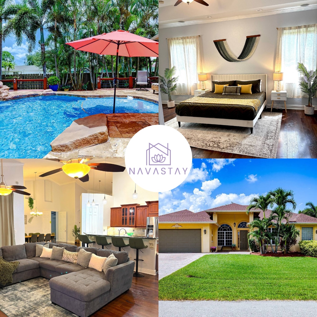 Escape to The Palm House! Featuring a brand new salt water pool, fountain, and outdoor kitchen oasis! Recently completed pool area is a tropical dream! Located just 15 minutes from the beach. Open concept great room with a chef’s kitchen and tropical views in every direction. Enjoy a true indoor outdoor South Florida experience with 20 foot sliders that open to the patio. Custom and modern touches in every room! You’ll love the lux built in bunkbeds! Stylish bedrooms with room to sleep 8.