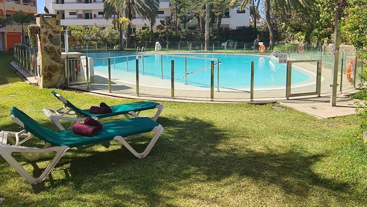 Ditt ideelle opphold i sør: renovert, lys og utstyrt leilighet. Romslig og kjølig på grunn av orienteringen, perfekt for langvarige opphold. Terrasse med utsikt over bassenget, to 1 x 2 m hotellsenger, sovesofa, trådløst nettverk, to smart-TV-er og kjøkken med stekeovn og mikrobølgeovn. Kompleks med svømmebasseng, hager og gratis parkering. Nær Kasbah, Yumbo og Águila Roja, supermarkeder og buss og taxi. Veldig godt forbundet for å komme seg rundt uten bil. Ideell for å rusle ved havet, bade og utforske øya.