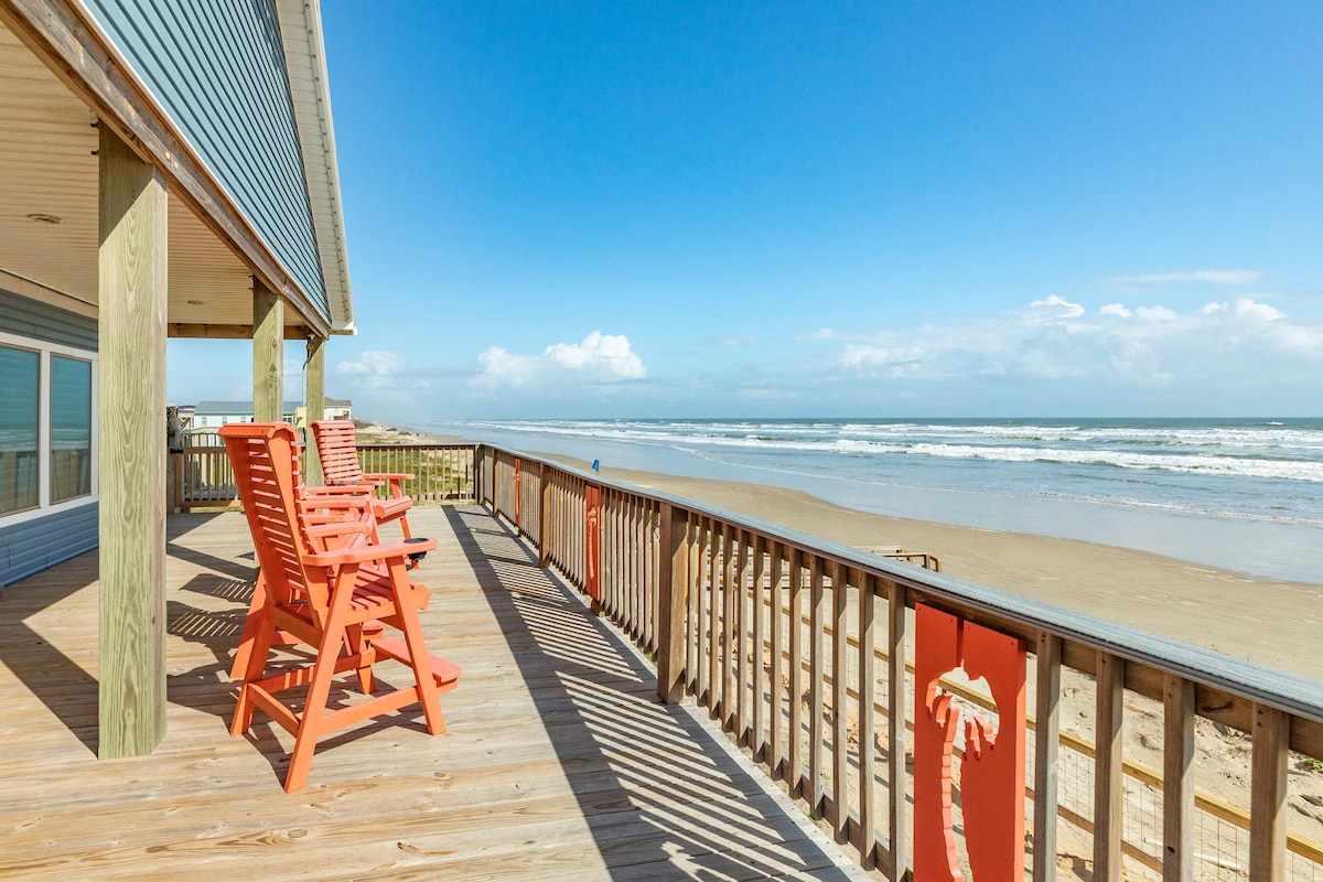 NY bygning ved stranden! Virkelig en enhjørning:🦄 BELIGGENHET, LUKSUS og så fint å ha NYTT! Ligger noen skritt unna de beste restaurantene og stranden i Surfside! Nyt hengekøyer og spill under huset. Klatre opp trappene til et fantastisk skyggefullt dekk med utsikt fra San Luis Pass helt til bryggen! Mer enn 180 graders uhindret utsikt. Soverom åpne til soldekk og stjernekikking med 🔥 bålplass YouTube Beachfront Luxe for video Rengjøringsgebyr på $ 125 og bare $ 75 totalt for opptil to kjæledyr for hele oppholdet!