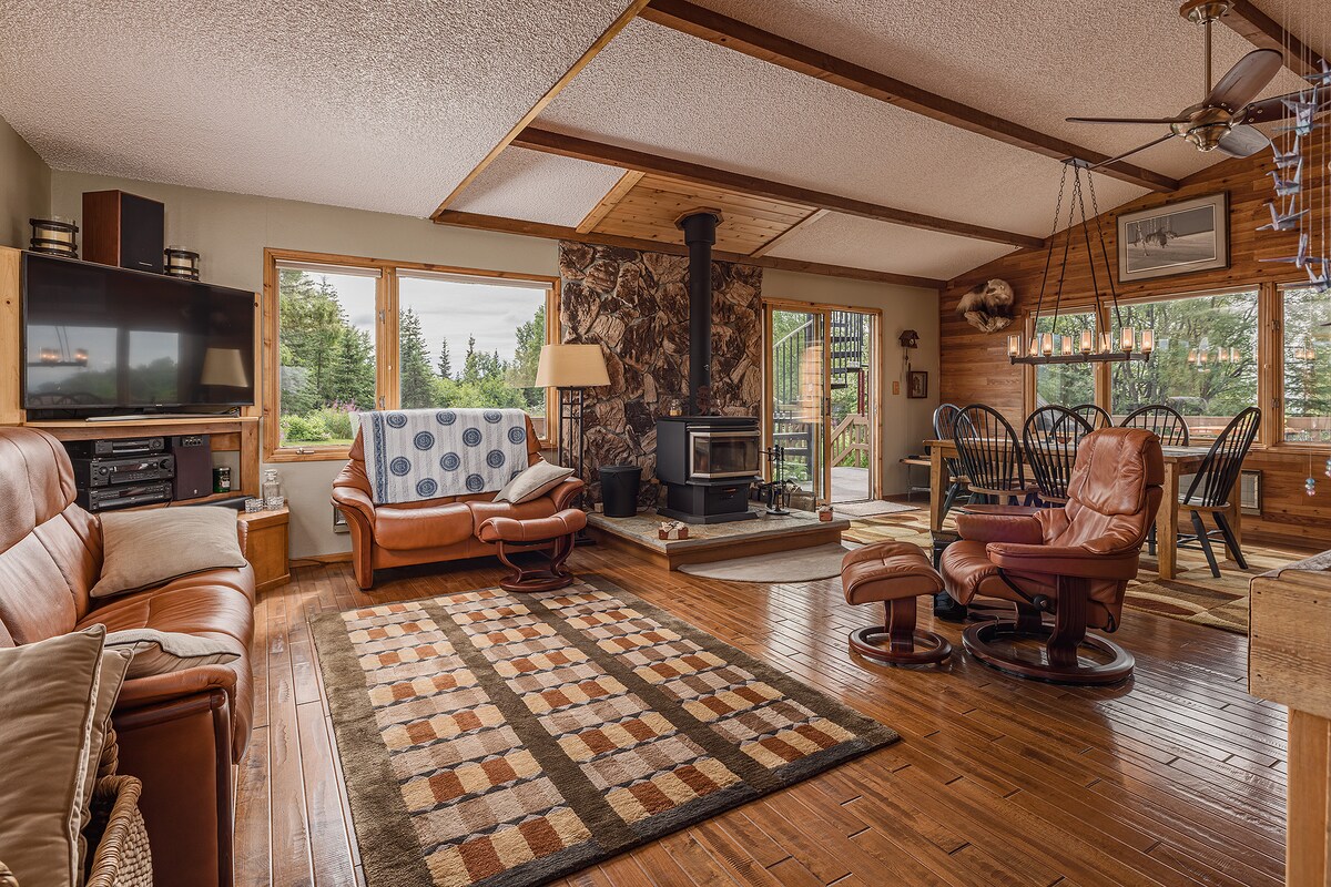 Et vakkert hjem i Alaska-stil. Omgitt av trær på over en halv hektar. Stor terrasse, grill og bålplass tilgjengelig for å nyte atmosfæren. Dette nydelige hjemmet med fire soverom har komfortabelt plass til åtte personer. Vi er villige til å ta imot noen flere med varsel om ekstra gjester. Vi ønsker fester/feiringer, bursdager osv. velkommen. Huset og kjøkkenet er fullt møblert med alt du trenger for å føle deg som hjemme. Kontakt oss for sesongrabatter og overnatting.