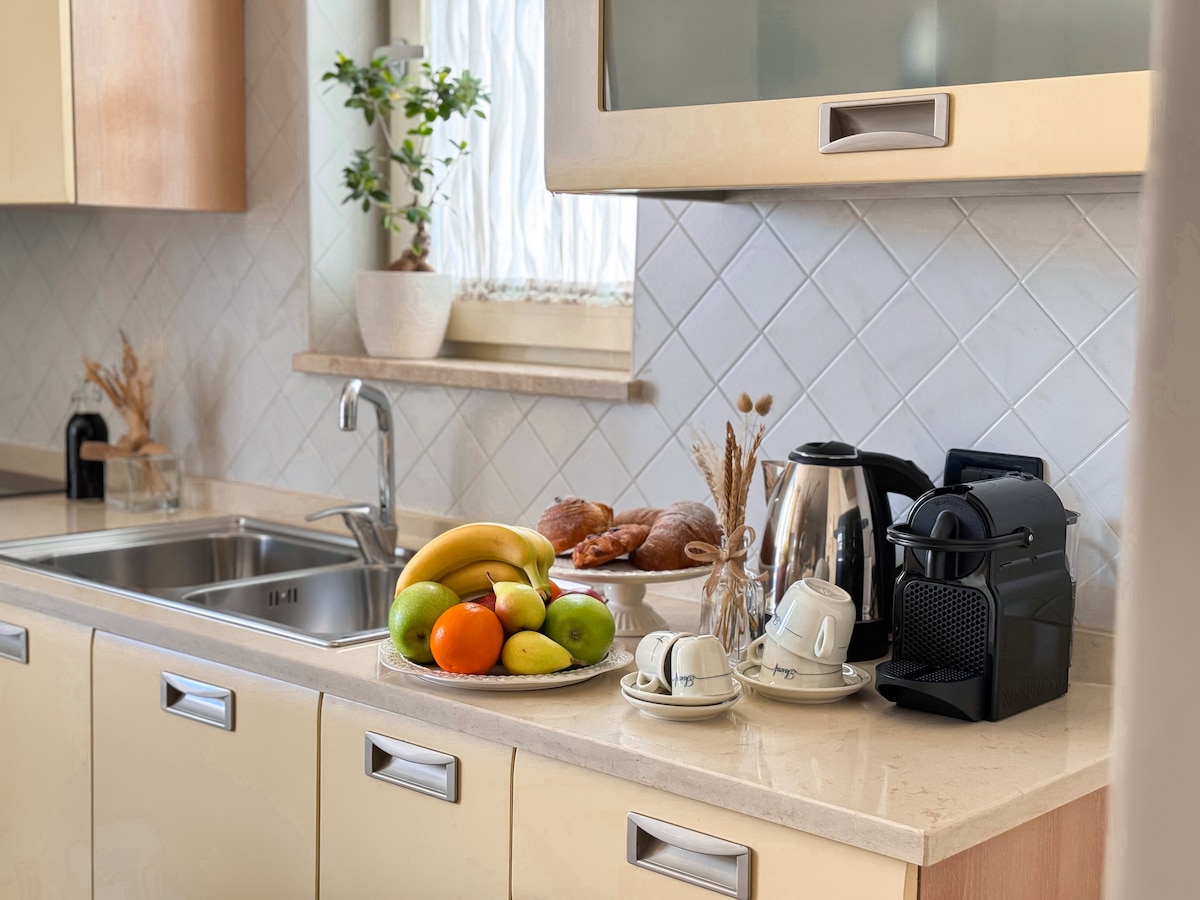 Lys og romslig designer to-roms leilighet i første etasje på eiendommen, ideell for korte og lange opphold, i et sentralt og kommersielt område i Cassano delle Murge. Noen få meter unna er det flere egne produserte dagligvarebutikker, barer og pizzeriaer. Det er også noen få skritt unna bussholdeplassene for Miulli sykehus og for Bari. I tillegg ligger Cassano delle Murge, i tillegg til å være en karakteristisk landsby, i et område like langt mellom byene Matera og Bari.