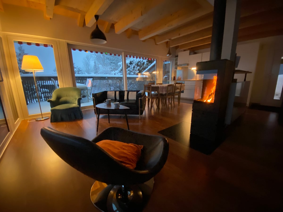Kom og skap minner i vårt unike, romslige og familievennlige hjem. Vi ligger åtte minutter over Montreux, fredelig plassert mellom en stor grønn åker og en liten vingård. Våkne opp til fantastisk utsikt over Lac Leman og Grammont-toppen og ta morgenkaffen eller et glass vin oppe på takterrasse. Vi er lett tilgjengelige, da Planchamp togstasjon ligger bare ett minutts gange fra ytterdøren, og vi har én gratis parkeringsplass. Så mange eventyr å oppleve.