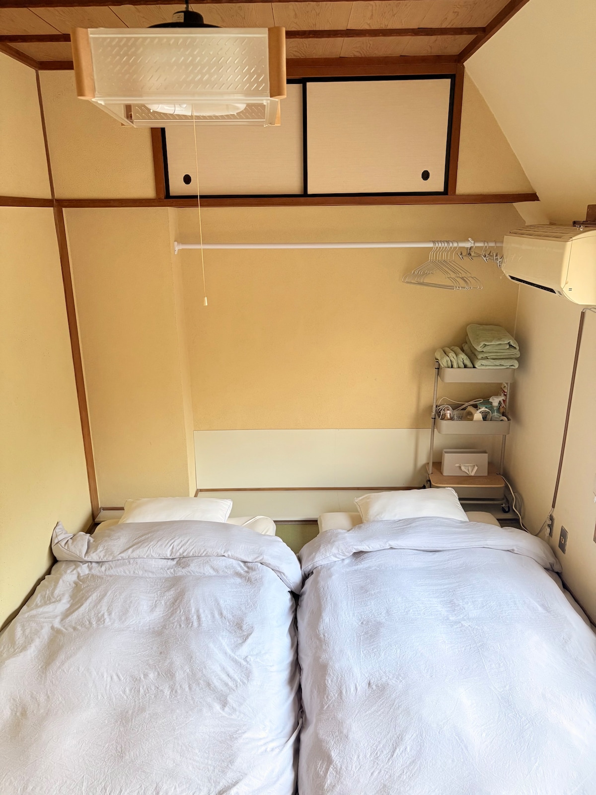 Det er et rolig rom i japansk stil på seks tatami rett ved siden av Dogo Park. Det er et kompakt sted, men du kan nyte en «japansk» atmosfære og et avslappende opphold. Plass til opp til 4 personer Det er tre enkeltsenger, og hvis du setter dem ved siden av hverandre, blir de ca. 300 cm brede (mer enn to dobbeltsenger). Det er fire futoner og fire puter, så det er plass til opptil fire voksne. Nyt en futon-opplevelse som er unik for Japan, i "elv"-stil med familien, eller lag minner med venner. Lavt bord og puter, perfekt for avslapning. Perfekt for en morgentur eller en kveldstur i Dogo Park, som ligger bare en kort spasertur unna. God tilgang til Dogo Onsen hovedbygning og shoppingdistrikt Med et helt nytt kjøkken kan du enkelt lage mat selv. Det er et supermarked og en nærbutikk innen fem minutters gange, noe som er praktisk for shopping. Utstyrt med trådløst nettverk, egner den seg til hjemmekontor og langvarige opphold. Vi tilbyr et enkelt og avslappende opphold hvor du ikke bare kan se severdigheter, men også oppleve «japansk liv».