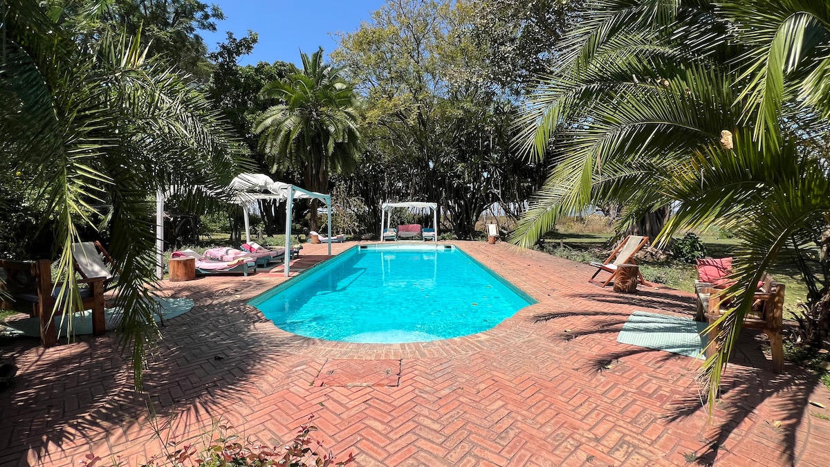 Tucked away on Lake Naivasha's southern shores in the Great Rift Valley, our charming thatched cottage, Hibiscus House, offers captivating Lake views & a cosy charm. Ideal for families, friends & couples seeking adventure & romance, or digital nomads or agricultural consultants, a great space to work from. Enjoy our pool & squash court, nearby attractions like Hells Gate, Mt. Longonot, Crescent Island, Sanctuary Farm & dining at Carnelley's next door. So much to do and to enjoy!