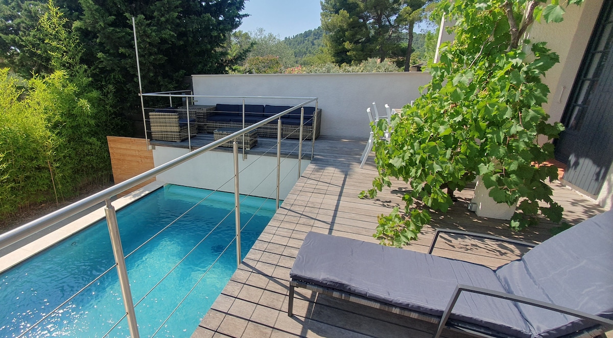 Feriebolig i Paradou. Oppvarmet basseng. Terrasse i tre.