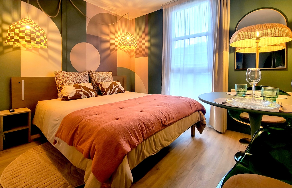 PROFF 💚 REISE eller OPPHOLD ❤ 2 personer (2 barn mulig!) 💚 Alt for å være AUTONOM! Gratis inngang, trådløst nettverk, USB-kontakt, PARKERING, utstyrt kjøkken, BAKERI to minutters gange til fots, FASILITETER + ++. 💚Alt for å ta vare på deg selv! FØRSTEKLASSES SENGETØY, ryddig innredning, STILLE innkvartering, søte godbiter, estetisk institutt på 2 minutter 💚 Alt å ta vare på! NETFLIX-TILGANG, spill, guide til gode utflukter, PARKER rett ved siden av boligen.