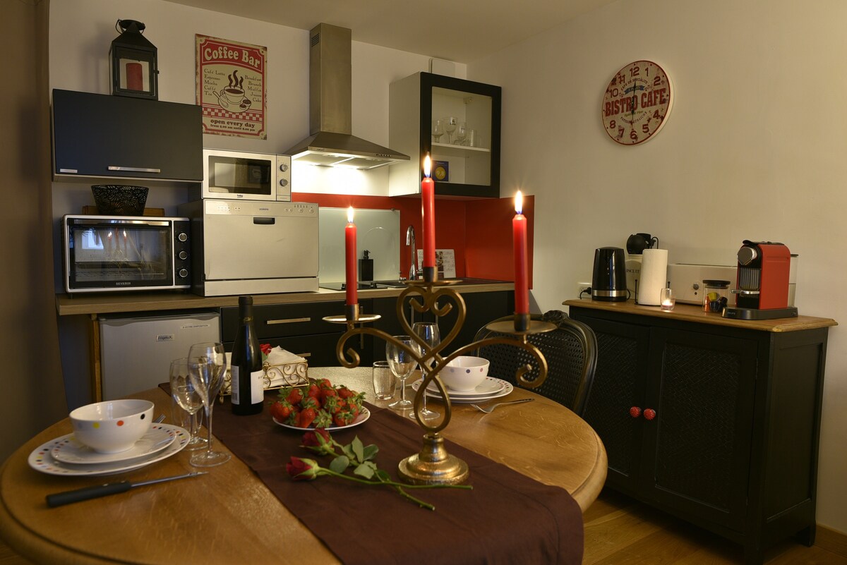 Denne boligen har en helt unik stil. En leilighet av høy standard for øyeblikk av avslapning og intimitet i en luksuriøs kontekst. En stue som åpner seg mot et kjøkken utstyrt med en stor videoprojektor og hjemmekino for å være helt oppslukt i en avslappende kveld. Romslig soverom med en QueenSize seng (160x200) garanterer komfort. Et luksuriøst bad med dusj med et boblebad for 3 personer og en badstue for 3/4 personer med direkte tilgang til soverommet.